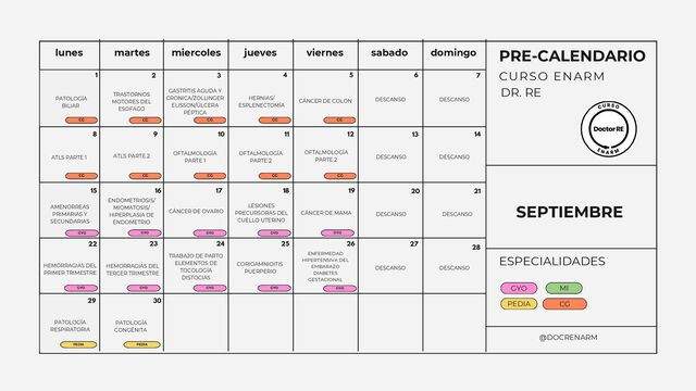 jueves viernes sabado domingo PRE-CALENDARIO SEPTIEMBRE ESPECIALIDADES @DOCRENARM CURSO ENARM DR. RE 4 5 6 7 8 9 10 11 12 13 14 15 16 17 18 19 20 21 22 23 24 28 29 30 25 26 27 TRASTORNOS MOTORES DEL ESOFAGO PATOLOGÍA BILIAR GASTRITIS AGUDA Y CRONICA/ZOLLINGER ELISSON/ÚLCERA PÉPTICA HERNIAS/ ESPLENECTOMÍA CÁNCER DE COLON ATLS PARTE 1 ATLS PARTE 2 OFTALMOLOGÍA PARTE 1 OFTALMOLOGÍA PARTE 2 OFTALMOLOGÍA PARTE 2 AMENORREAS PRIMARIAS Y SECUNDARIAS ENDOMETRIOSIS/ MIOMATOSIS/ HIPERPLASIA DE ENDOMETRIO CÁNCER DE OVARIO LESIONES PRECURSORAS DEL CUELLO UTERINO CÁNCER DE MAMA HEMORRAGIAS DEL PRIMER TRIMESTRE HEMORRAGIAS DEL TERCER TRIMESTRE TRABAJO DE PARTO ELEMENTOS DE TOCOLOGÍA DISTOCIAS CORIOAMNIOITIS PUERPERIO ENFERMEDAD HIPERTENSIVA DEL EMBARAZO DIABETES GESTACIONAL PATOLOGÍA RESPIRATORIA PATOLOGÍA CONGÉNITA CG CG CG CG CG CG CG CG CG CG GYO GYO GYO GYO GYO GYO GYO GYO GYO GYO PEDIA PEDIA DESCANSO DESCANSO DESCANSO DESCANSO DESCANSO DESCANSO DESCANSO DESCANSO