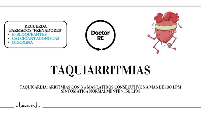en AVR • P antes de QRS con eje entre 0 y 90 • PR 0.12 a 0.2 segundos RITMO SINUSAL > 100 LPM • POR DISPARO: ejercicio, ansiedad, fiebre,hipotension, hipertiroidismo, cafeina, cocaina CAUSA • Tratar causa responsable • B-bloqueadores si se vuelve sintomática TRATAMIENTO TAQUICARDIA SINUSAL