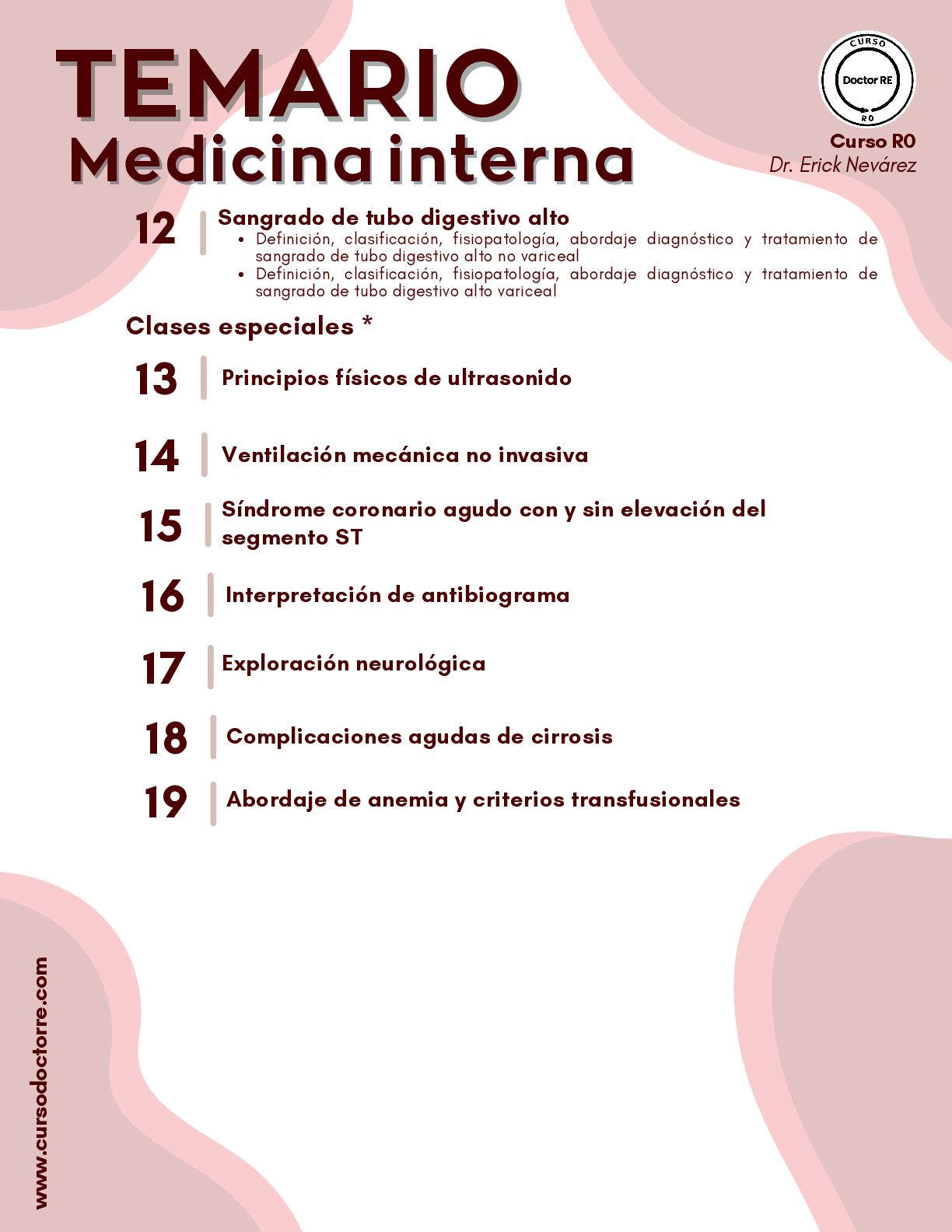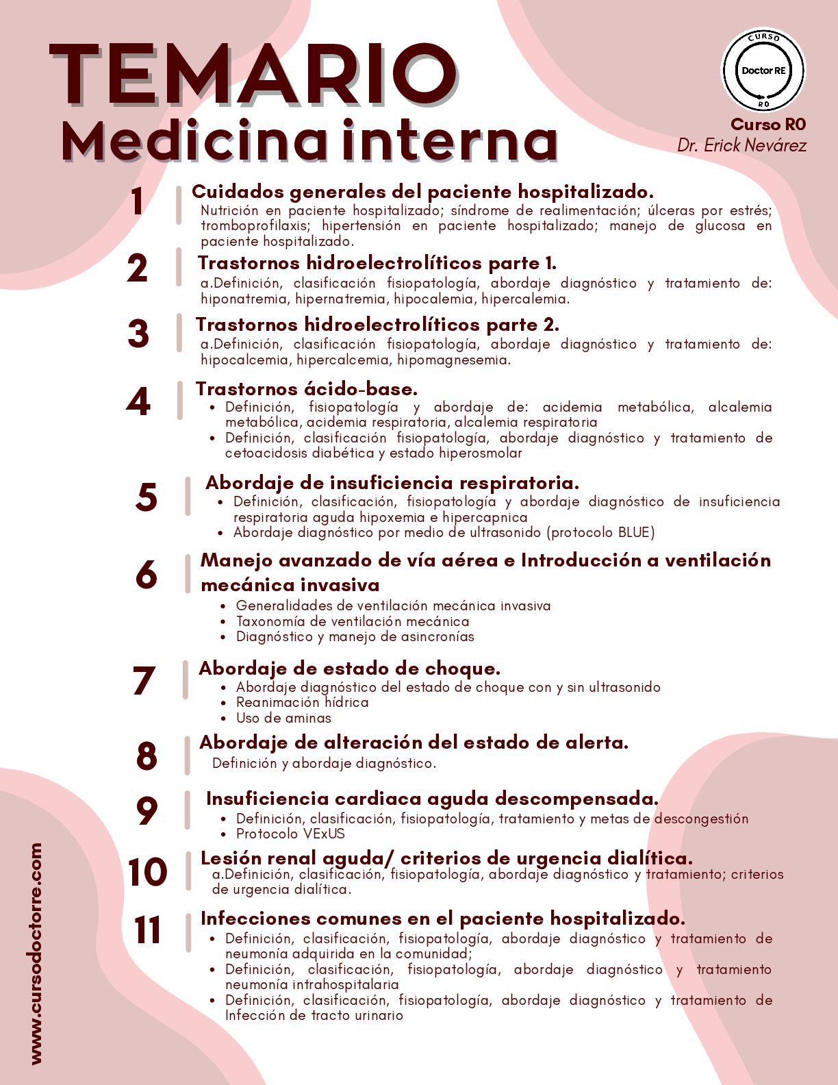 paciente hospitalizado. 1 4 7 2 5 6 www.cursodoctorre.com 8 11 10 Trastornos hidroelectrolíticos parte 1. Trastornos ácido-base. Abordaje de insuficiencia respiratoria. Manejo avanzado de vía aérea e Introducción a ventilación mecánica invasiva Abordaje de estado de choque. Abordaje de alteración del estado de alerta. Lesión renal aguda/ criterios de urgencia dialítica. Infecciones comunes en el paciente hospitalizado. Medicina interna Medicina interna 3 Trastornos hidroelectrolíticos parte 2. 9 Insuficiencia cardiaca aguda descompensada. Nutrición en paciente hospitalizado; síndrome de realimentación; úlceras por estrés; tromboprofilaxis; hipertensión en paciente hospitalizado; manejo de glucosa en paciente hospitalizado. a.Definición, clasificación fisiopatología, abordaje diagnóstico y tratamiento de: hiponatremia, hipernatremia, hipocalemia, hipercalemia. a.Definición, clasificación fisiopatología, abordaje diagnóstico y tratamiento de: hipocalcemia, hipercalcemia, hipomagnesemia. Definición, fisiopatología y abordaje de: acidemia metabólica, alcalemia metabólica, acidemia respiratoria, alcalemia respiratoria Definición, clasificación fisiopatología, abordaje diagnóstico y tratamiento de cetoacidosis diabética y estado hiperosmolar Definición, clasificación, fisiopatología y abordaje diagnóstico de insuficiencia respiratoria aguda hipoxemia e hipercapnica Abordaje diagnóstico por medio de ultrasonido (protocolo BLUE) Generalidades de ventilación mecánica invasiva Taxonomía de ventilación mecánica Diagnóstico y manejo de asincronías Abordaje diagnóstico del estado de choque con y sin ultrasonido Reanimación hídrica Uso de aminas Definición y abordaje diagnóstico. Definición, clasificación, fisiopatología, tratamiento y metas de descongestión Protocolo VExUS a.Definición, clasificación, fisiopatología, abordaje diagnóstico y tratamiento; criterios de urgencia dialítica. Definición, clasificación, fisiopatología, abordaje diagnóstico y tratamiento de neumonía adquirida en la comunidad; Definición, clasificación, fisiopatología, abordaje diagnóstico y tratamiento neumonía intrahospitalaria Definición, clasificación, fisiopatología, abordaje diagnóstico y tratamiento de Infección de tracto urinario
