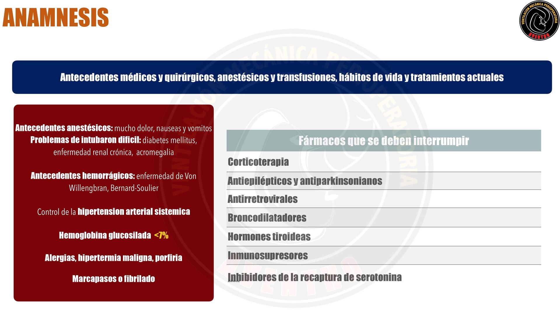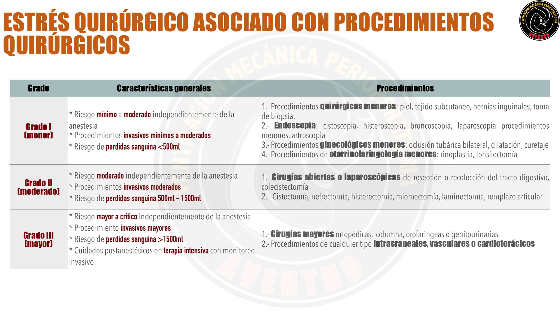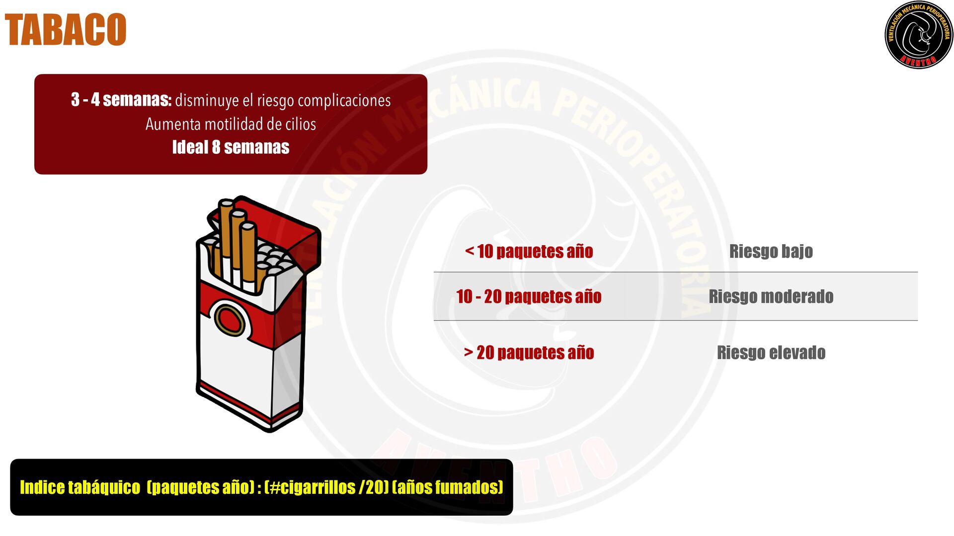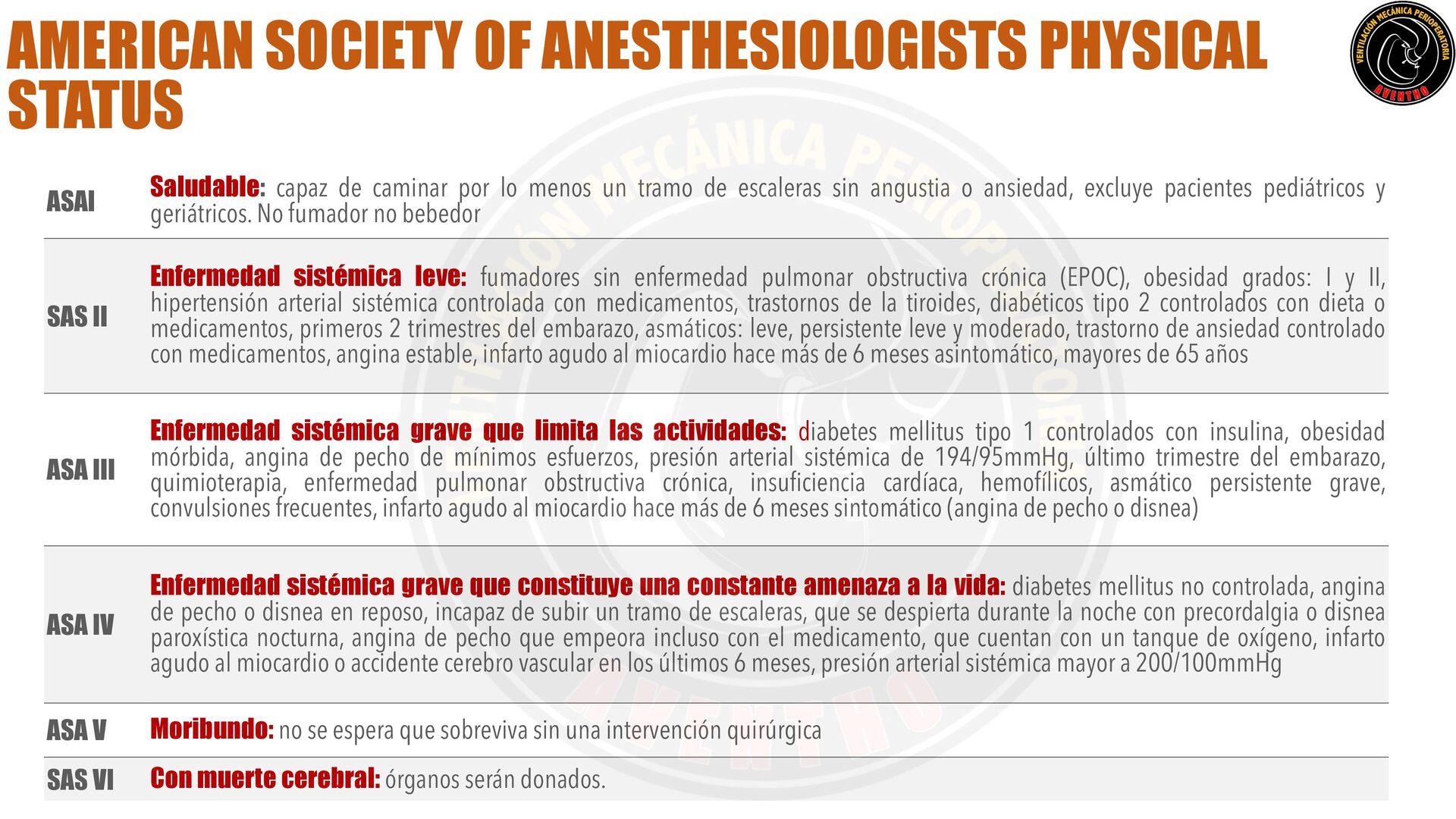 caminar por lo menos un tramo de escaleras sin angustia o ansiedad, excluye pacientes pediátricos y geriátricos. No fumador no bebedor SAS II Enfermedad sistémica leve: fumadores sin enfermedad pulmonar obstructiva crónica (EPOC), obesidad grados: I y II, hipertensión arterial sistémica controlada con medicamentos, trastornos de la tiroides, diabéticos tipo 2 controlados con dieta o medicamentos, primeros 2 trimestres del embarazo, asmáticos: leve, persistente leve y moderado, trastorno de ansiedad controlado con medicamentos, angina estable, infarto agudo al miocardio hace más de 6 meses asintomático, mayores de 65 años ASA III Enfermedad sistémica grave que limita las actividades: diabetes mellitus tipo 1 controlados con insulina, obesidad mórbida, angina de pecho de mínimos esfuerzos, presión arterial sistémica de 194/95mmHg, último trimestre del embarazo, quimioterapia, enfermedad pulmonar obstructiva crónica, insu fi ciencia cardíaca, hemofílicos, asmático persistente grave, convulsiones frecuentes, infarto agudo al miocardio hace más de 6 meses sintomático (angina de pecho o disnea) ASA IV Enfermedad sistémica grave que constituye una constante amenaza a la vida: diabetes mellitus no controlada, angina de pecho o disnea en reposo, incapaz de subir un tramo de escaleras, que se despierta durante la noche con precordalgia o disnea paroxística nocturna, angina de pecho que empeora incluso con el medicamento, que cuentan con un tanque de oxígeno, infarto agudo al miocardio o accidente cerebro vascular en los últimos 6 meses, presión arterial sistémica mayor a 200/100mmHg ASA V Moribundo: no se espera que sobreviva sin una intervención quirúrgica SAS VI Con muerte cerebral: órganos serán donados.