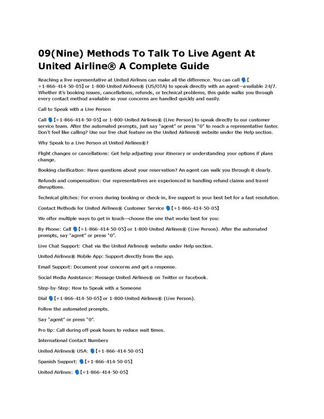 A Complete Guide Reaching a live representative at United Airlines can make all the difference. You can call 🗣️【 +1-866-414-50-05】 or 1-800-United Airlines® (US/OTA) to speak directly with an agent—available 24/7. Whether it’s booking issues, cancellations, refunds, or technical problems, this guide walks you through every contact method available so your concerns are handled quickly and easily. Call to Speak with a Live Person Call 🗣️【+1-866-414-50-05】 or 1-800-United Airlines® (Live Person) to speak directly to our customer service team. After the automated prompts, just say “agent” or press “0” to reach a representative faster. Don’t feel like calling? Use our live chat feature on the United Airlines® website under the Help section. Why Speak to a Live Person at United Airlines®? Flight changes or cancellations: Get help adjusting your itinerary or understanding your options if plans change. Booking clarification: Have questions about your reservation? An agent can walk you through it clearly. Refunds and compensation: Our representatives are experienced in handling refund claims and travel disruptions. Technical glitches: For errors during booking or check-in, live support is your best bet for a fast resolution. Contact Methods for United Airlines® Customer Service 🗣️【+1-866-414-50-05】 We offer multiple ways to get in touch—choose the one that works best for you: By Phone: Call 🗣️【+1-866-414-50-05】 or 1-800-United Airlines® (Live Person). After the automated prompts, say “agent” or press “0”. Live Chat Support: Chat via the United Airlines® website under Help section. United Airlines® Mobile App: Support directly from the app. Email Support: Document your concerns and get a response. Social Media Assistance: Message United Airlines® on Twitter or Facebook. Step-by-Step: How to Speak with a Someone Dial 🗣️【+1-866-414-50-05】 or 1-800-United Airlines® (Live Person). Follow the automated prompts. Say “agent” or press “0”. Pro tip: Call during off-peak hours to reduce wait times. International Contact Numbers United Airlines® USA: 🗣️【+1-866-414-50-05】 Spanish Support: 🗣️【+1-866-414-50-05】 United Airlines: 🗣️【+1-866-414-50-05】