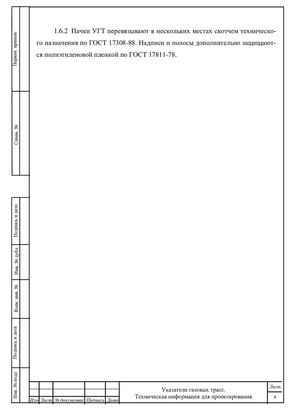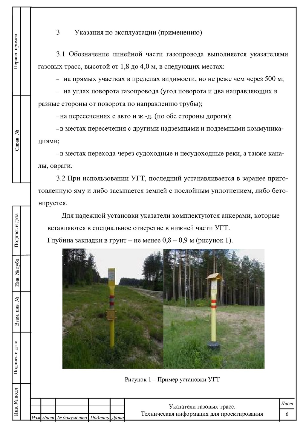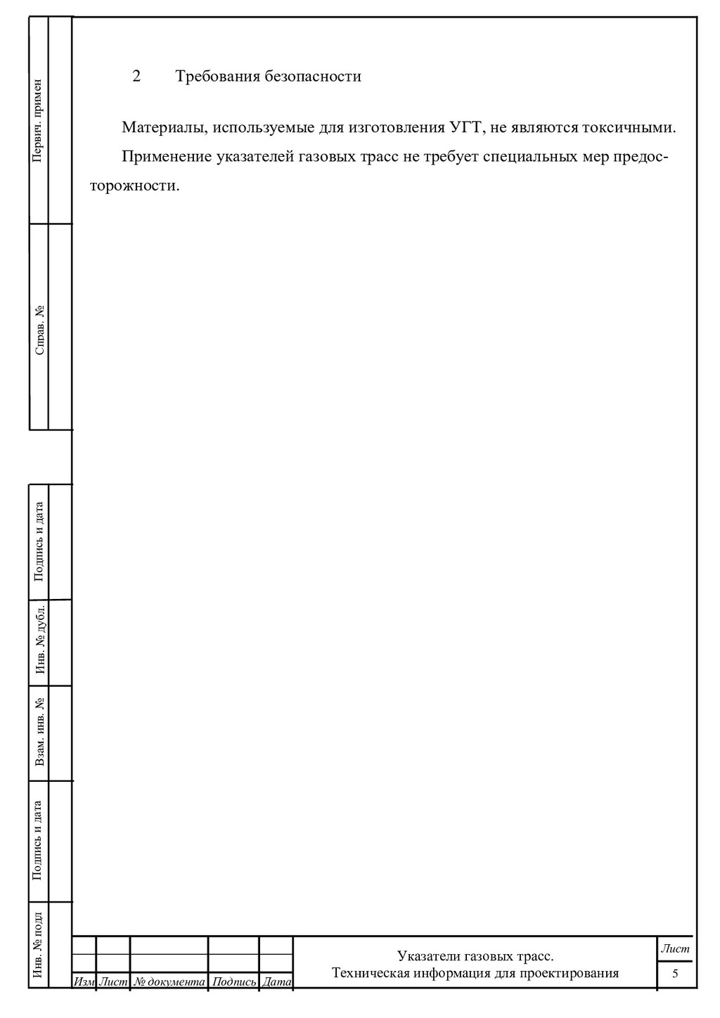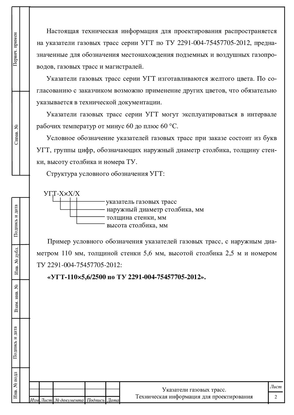 и дата Первич. примен Справ. № Изм Лист № документа Подпись Дата Лист 3 Указатели газовых трасс. Техническая информация для проектирования Инв. № дубл. 1 Технические характеристики 1.1 Указатели газовых трасс соответствуют требованиям ТУ 2247-004-75457705-2012. 1.2 Указатели газовых трасс изготавливаются из марок полиэтилена низкого давления по ГОСТ 16388-85 с добавлением минеральных наполнителей, повышающих огнестойкость изделия. 1.3 Наружная поверхность УГТ ровная, без трещин, пор, пузырей и отслоений. Внутренняя поверхность указателей не имеет выступов. На внутренней и внешней поверхности УГТ допускаются следы от фор- мующей оснастки. 1.4 Размеры УГТ соответствуют нормам, приведенным в таблице 1. Таблица 1 – Размеры УГТ Условное обозна- чение Размеры Толщина стенки, мм диаметр наружный, мм длина, мм номинал предельное отклонение номинал предель- ное от- клонение УГТ-75×5/1800 75 +0,6 1800 +0,20; -0,10 5,0 УГТ-110×5,6/2500 110 +1,0 2500 ±0,20 5,6 УГТ-110×5,6/3000 110 +1,0 3000 ±0,20 5,6 УГТ-110×5,6/4000 110 +1,0 4000 ±0,20 5,6 Примечание – По согласованию с заказчиком, указатели газовых трасс мо- гут изготавливаться других типоразмеров. 1.5 Конструктивное исполнение УГТ соответствует Приложению В. 1.6 Упаковка указателей газовых трасс: 1.6.1 УГТ одного типоразмера складываются в пачки по шесть штук при диаметре 75 мм и по три штуки при диаметре 110 мм.