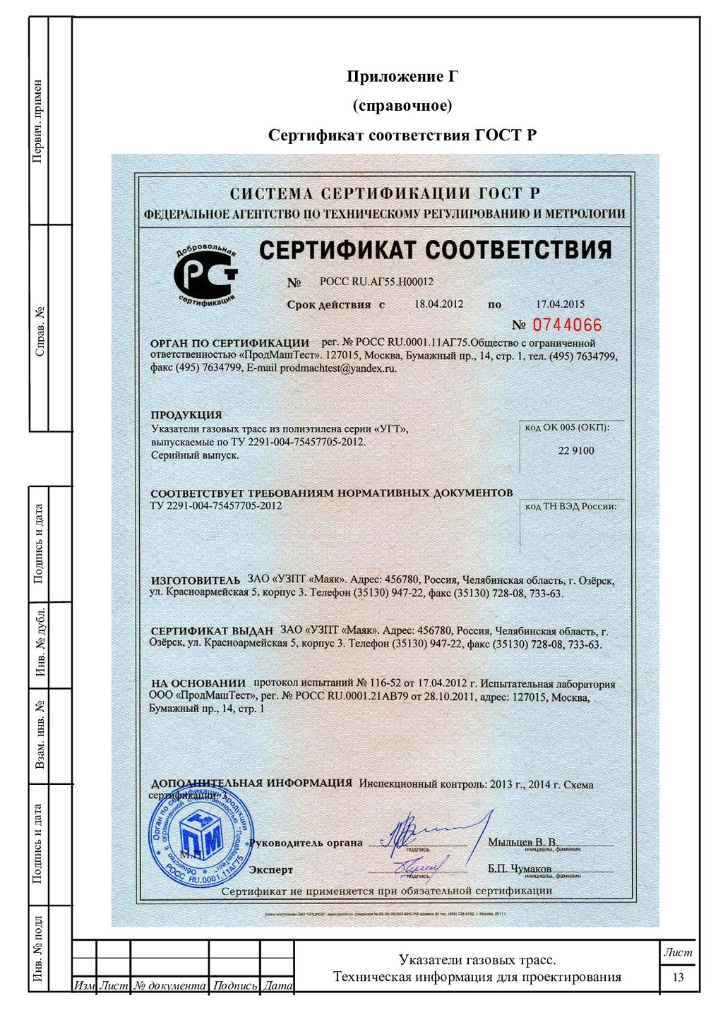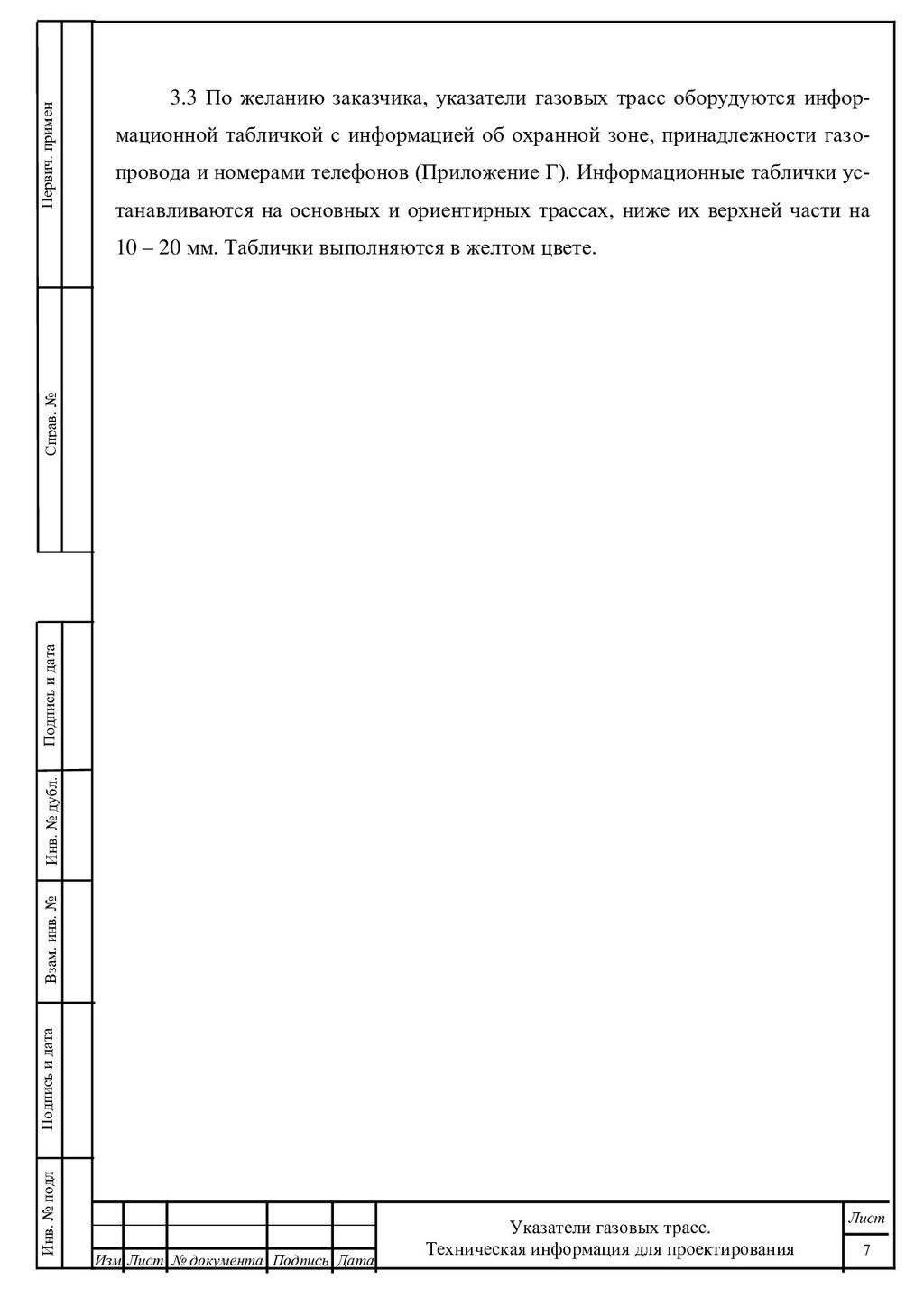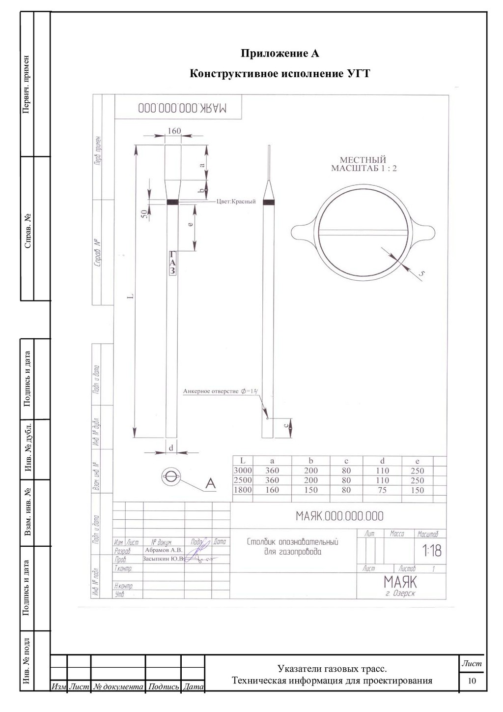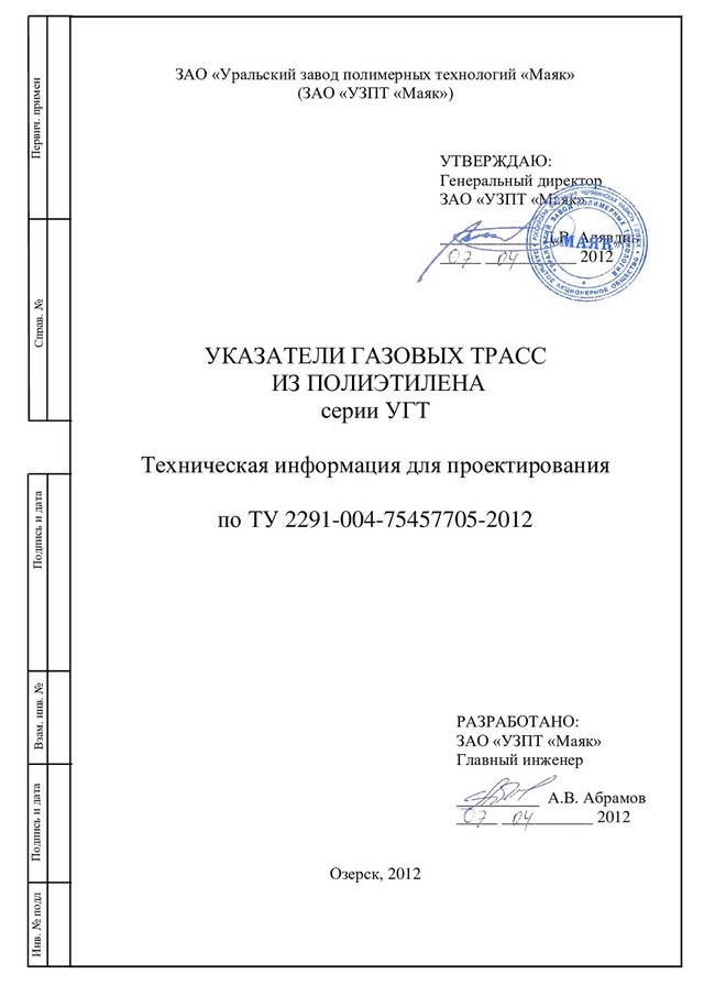 и дата Первич. примен Справ. № Изм Лист № документа Подпись Дата Лист 3 Указатели газовых трасс. Техническая информация для проектирования Инв. № дубл. 1 Технические характеристики 1.1 Указатели газовых трасс соответствуют требованиям ТУ 2247-004-75457705-2012. 1.2 Указатели газовых трасс изготавливаются из марок полиэтилена низкого давления по ГОСТ 16388-85 с добавлением минеральных наполнителей, повышающих огнестойкость изделия. 1.3 Наружная поверхность УГТ ровная, без трещин, пор, пузырей и отслоений. Внутренняя поверхность указателей не имеет выступов. На внутренней и внешней поверхности УГТ допускаются следы от фор- мующей оснастки. 1.4 Размеры УГТ соответствуют нормам, приведенным в таблице 1. Таблица 1 – Размеры УГТ Условное обозна- чение Размеры Толщина стенки, мм диаметр наружный, мм длина, мм номинал предельное отклонение номинал предель- ное от- клонение УГТ-75×5/1800 75 +0,6 1800 +0,20; -0,10 5,0 УГТ-110×5,6/2500 110 +1,0 2500 ±0,20 5,6 УГТ-110×5,6/3000 110 +1,0 3000 ±0,20 5,6 УГТ-110×5,6/4000 110 +1,0 4000 ±0,20 5,6 Примечание – По согласованию с заказчиком, указатели газовых трасс мо- гут изготавливаться других типоразмеров. 1.5 Конструктивное исполнение УГТ соответствует Приложению В. 1.6 Упаковка указателей газовых трасс: 1.6.1 УГТ одного типоразмера складываются в пачки по шесть штук при диаметре 75 мм и по три штуки при диаметре 110 мм.