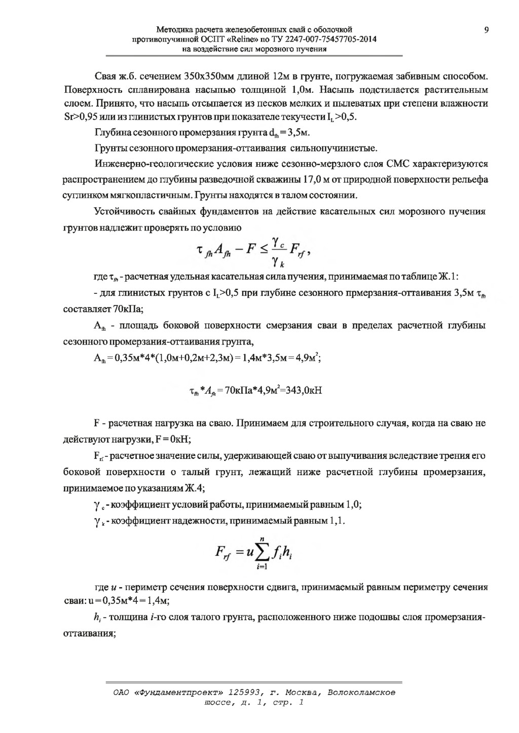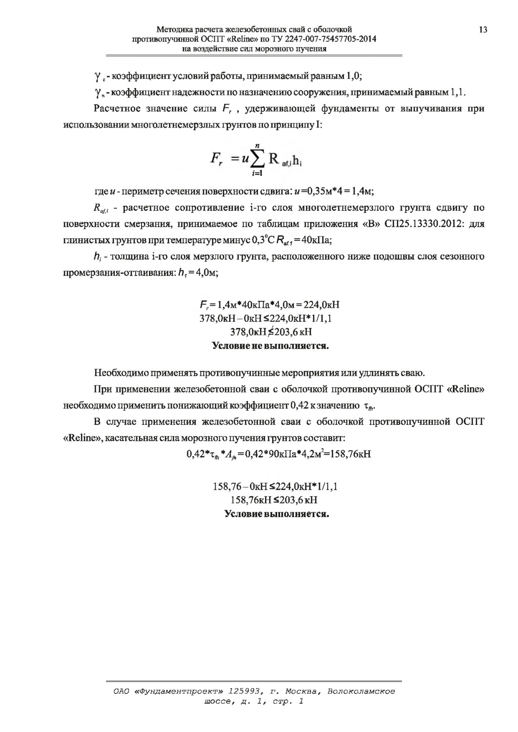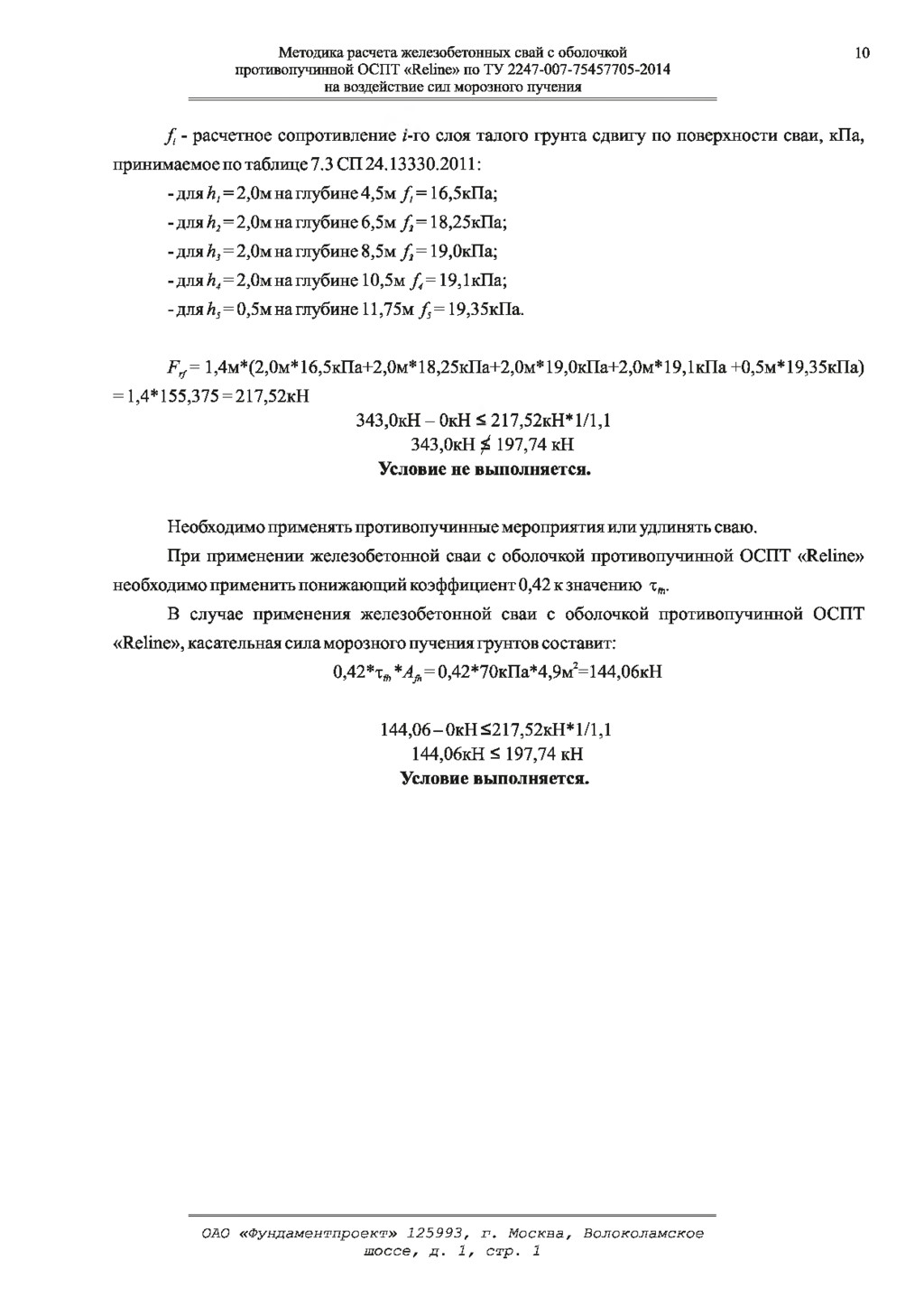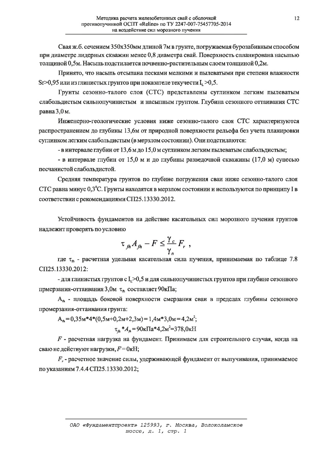 ТУ 2247-007-75457705-2014 на воздействие сил морозного пучения 10 f - расчетное сопротивление г-го слоя талого грунта сдвигу по поверхности сваи, кПа, принимаемое по таблице 7.3 СП 24.13330.2011: - для h, = 2,0м на глубине 4,5м / = 16,5кПа; - для h2=2,0м на глубине 6,5м f= 18,25кПа; - для h3 = 2,0м на глубине 8,5м f= 19,0кПа; - для h4= 2,0м на глубине 10,5м f 4= 19,1кПа; - для hs= 0,5м на глубине 11,75м f s= 19,35кПа. F j= l ,4м*(2,0м* 16,5кПа+2,0м* 18,25кПа+2,0м* 19,0кПа+2,0м* 19,1 кПа +0,5м* 19,35кПа) = 1,4*155,375 = 217,52кН 343,ОкН - ОкН < 217,52кН* 1/1,1 343,ОкН ^ 197,74 кН Условие не выполняется. Необходимо применять противопучинные мероприятия или удлинять сваю. При применении железобетонной сваи с оболочкой противопучинной ОСПТ «Reline» необходимо применить понижающий коэффициент 0,42 к значению хт . В случае применения железобетонной сваи с оболочкой противопучинной ОСПТ «Reline», касательная сила морозного пучения грунтов составит: 0,42*Хд, *^=0,42*70кПа*4,9м2 =144,06кН 144,06 - ОкН :£217,52кН* 1/1,1 144,06кН £ 197,74 кН Условие выполняется. ОАО «Фундаментпроект» 125993, г. Москва, Волоколамское шоссе, д. 1, стр. 1