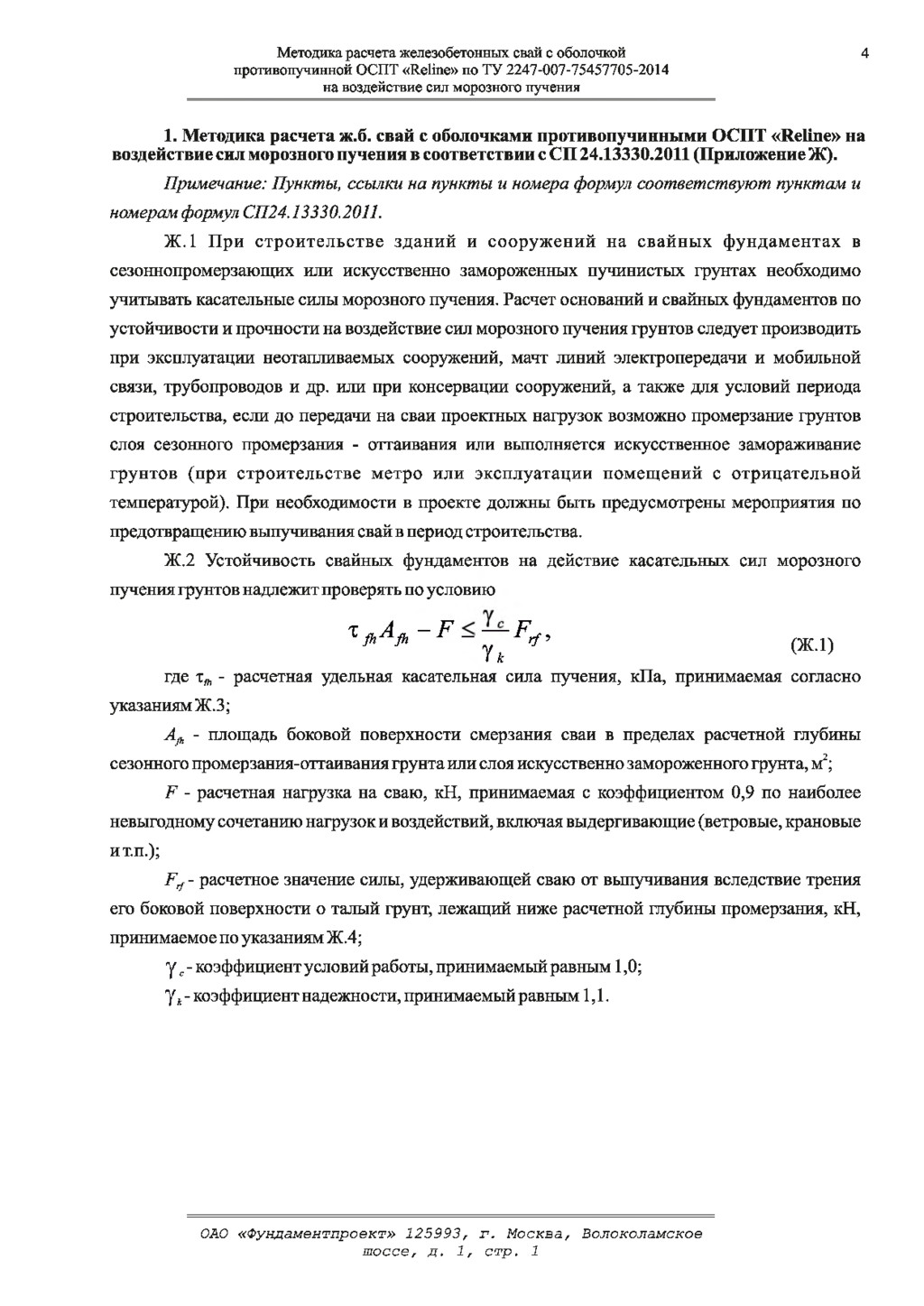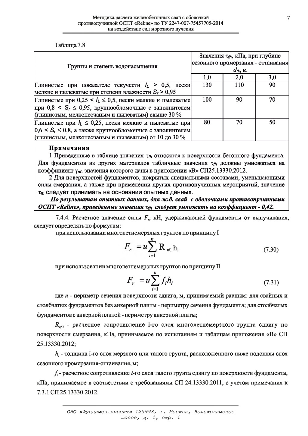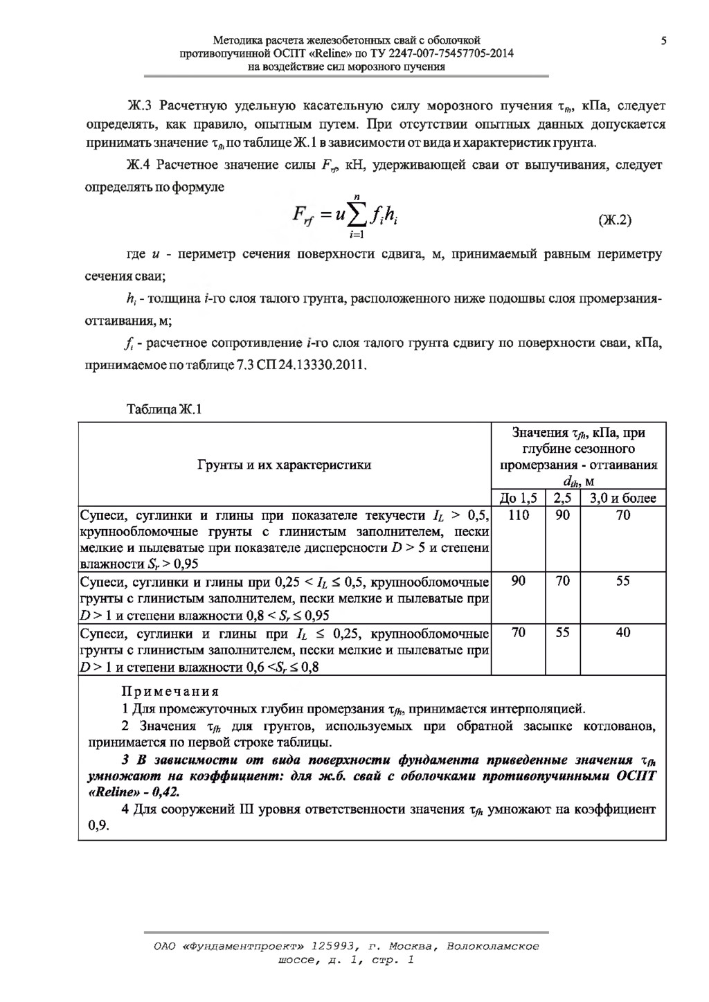 ТУ 2247-007-75457705-2014 на воздействие сил морозного пучения 10 f - расчетное сопротивление г-го слоя талого грунта сдвигу по поверхности сваи, кПа, принимаемое по таблице 7.3 СП 24.13330.2011: - для h, = 2,0м на глубине 4,5м / = 16,5кПа; - для h2=2,0м на глубине 6,5м f= 18,25кПа; - для h3 = 2,0м на глубине 8,5м f= 19,0кПа; - для h4= 2,0м на глубине 10,5м f 4= 19,1кПа; - для hs= 0,5м на глубине 11,75м f s= 19,35кПа. F j= l ,4м*(2,0м* 16,5кПа+2,0м* 18,25кПа+2,0м* 19,0кПа+2,0м* 19,1 кПа +0,5м* 19,35кПа) = 1,4*155,375 = 217,52кН 343,ОкН - ОкН < 217,52кН* 1/1,1 343,ОкН ^ 197,74 кН Условие не выполняется. Необходимо применять противопучинные мероприятия или удлинять сваю. При применении железобетонной сваи с оболочкой противопучинной ОСПТ «Reline» необходимо применить понижающий коэффициент 0,42 к значению хт . В случае применения железобетонной сваи с оболочкой противопучинной ОСПТ «Reline», касательная сила морозного пучения грунтов составит: 0,42*Хд, *^=0,42*70кПа*4,9м2 =144,06кН 144,06 - ОкН :£217,52кН* 1/1,1 144,06кН £ 197,74 кН Условие выполняется. ОАО «Фундаментпроект» 125993, г. Москва, Волоколамское шоссе, д. 1, стр. 1