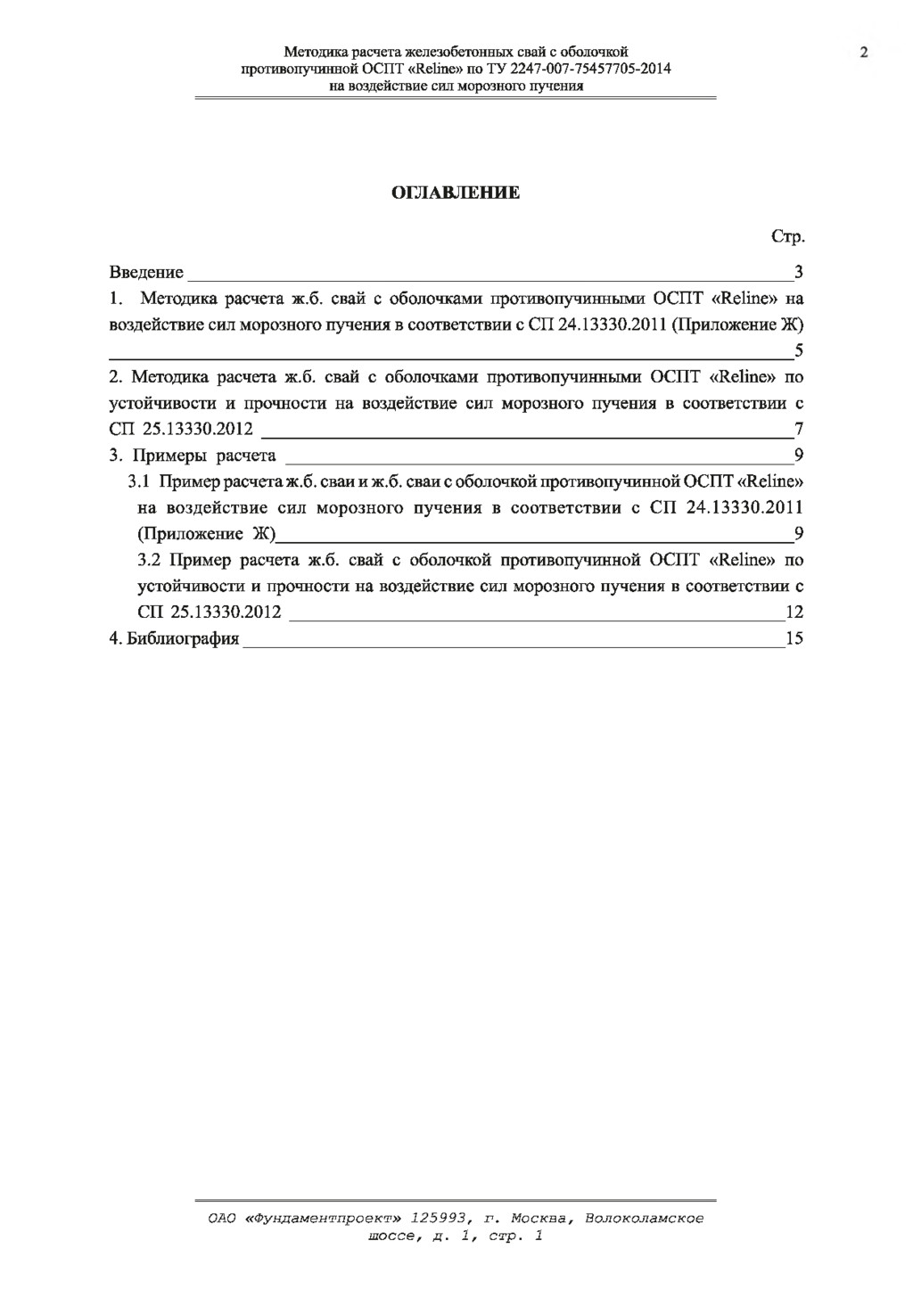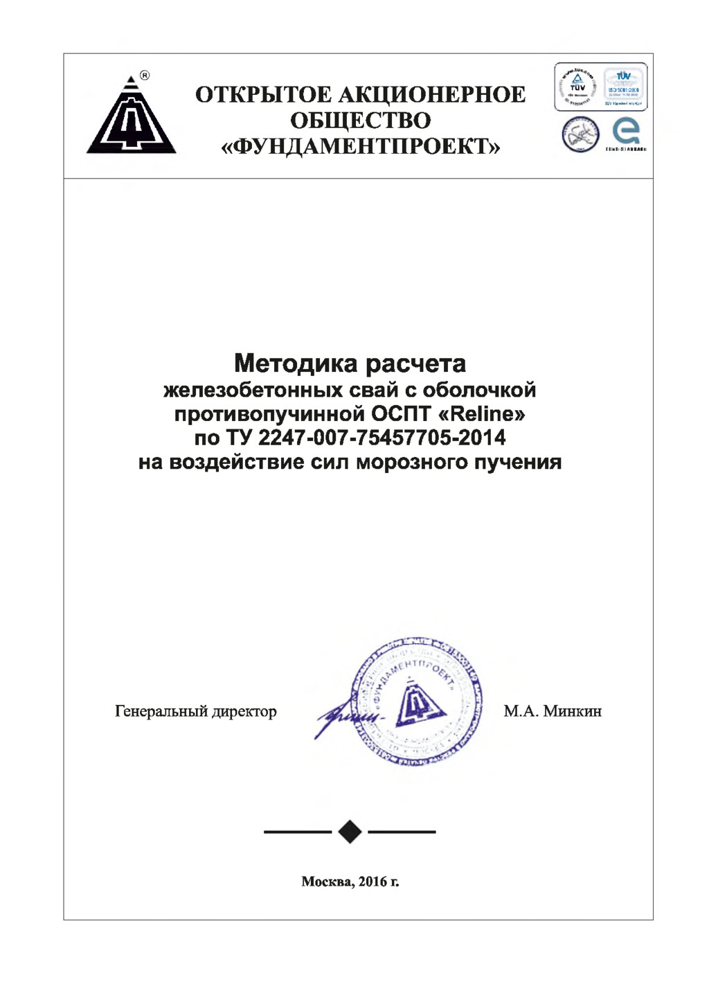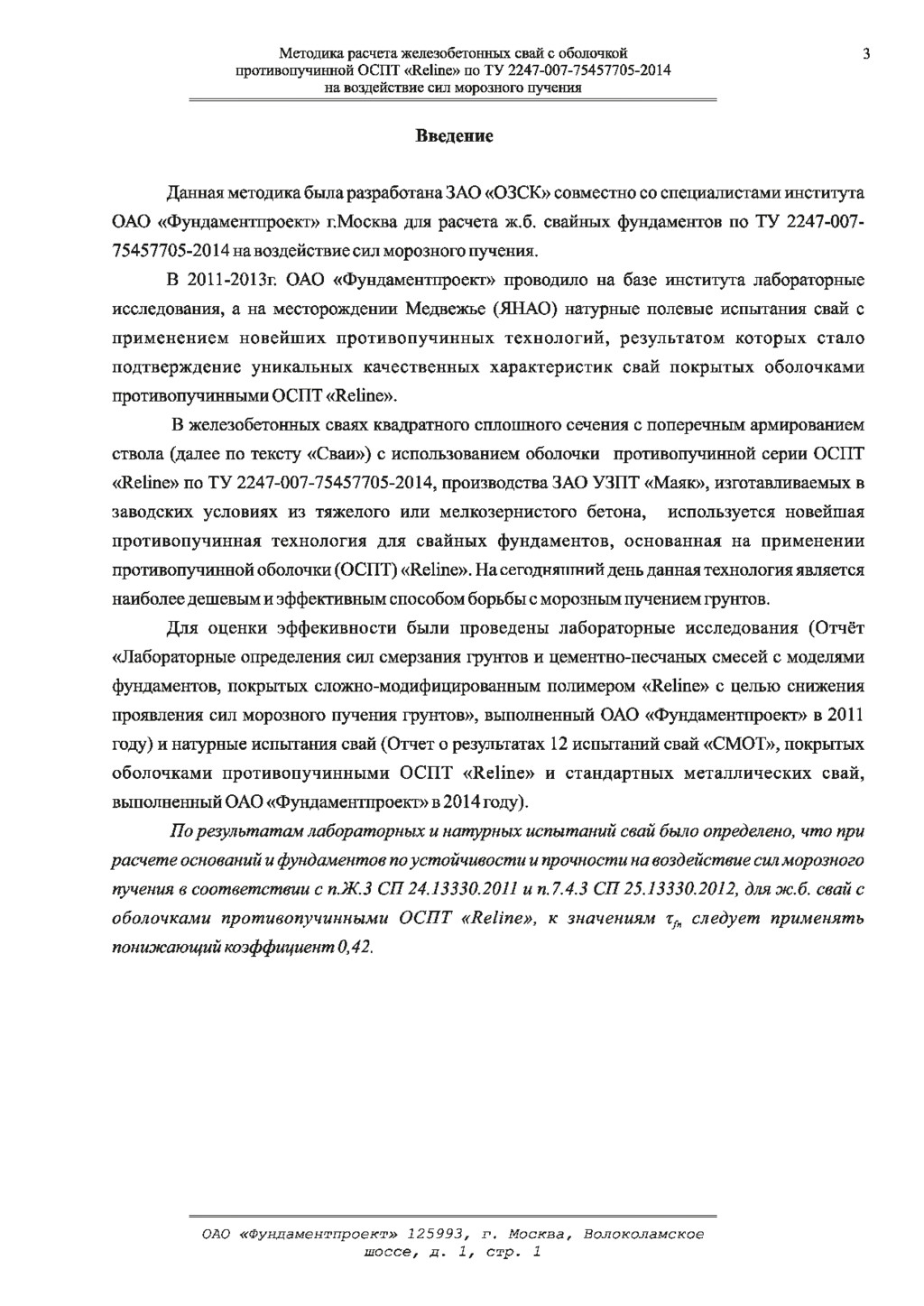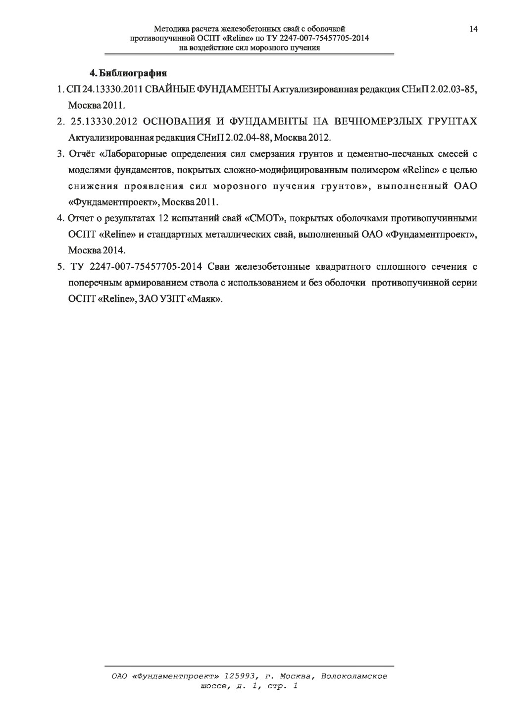 ТУ 2247-007-75457705-2014 на воздействие сил морозного пучения 10 f - расчетное сопротивление г-го слоя талого грунта сдвигу по поверхности сваи, кПа, принимаемое по таблице 7.3 СП 24.13330.2011: - для h, = 2,0м на глубине 4,5м / = 16,5кПа; - для h2=2,0м на глубине 6,5м f= 18,25кПа; - для h3 = 2,0м на глубине 8,5м f= 19,0кПа; - для h4= 2,0м на глубине 10,5м f 4= 19,1кПа; - для hs= 0,5м на глубине 11,75м f s= 19,35кПа. F j= l ,4м*(2,0м* 16,5кПа+2,0м* 18,25кПа+2,0м* 19,0кПа+2,0м* 19,1 кПа +0,5м* 19,35кПа) = 1,4*155,375 = 217,52кН 343,ОкН - ОкН < 217,52кН* 1/1,1 343,ОкН ^ 197,74 кН Условие не выполняется. Необходимо применять противопучинные мероприятия или удлинять сваю. При применении железобетонной сваи с оболочкой противопучинной ОСПТ «Reline» необходимо применить понижающий коэффициент 0,42 к значению хт . В случае применения железобетонной сваи с оболочкой противопучинной ОСПТ «Reline», касательная сила морозного пучения грунтов составит: 0,42*Хд, *^=0,42*70кПа*4,9м2 =144,06кН 144,06 - ОкН :£217,52кН* 1/1,1 144,06кН £ 197,74 кН Условие выполняется. ОАО «Фундаментпроект» 125993, г. Москва, Волоколамское шоссе, д. 1, стр. 1