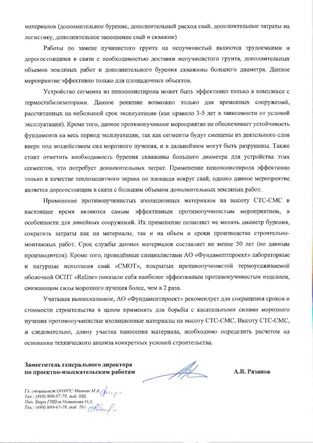 дополнительное заполнение свай и скважин) Работы по замене пучинистого грунта на непучинистый являются трудоемкими и дорогостоящими в связи с необходимостью доставки непучинистого грунта, дополнительных объемов земляных работ и дополнительного бурения скважины большего диаметра. Данное мероприятие эффективно только для площадочных объектов. Устройство сегмента из пенополистирола может быть эффективно только в комплексе с термостабилизаторами. Данное решение возможно только для временных сооружений, рассчитанных на небольшой срок эксплуатации (как правило 3-5 лет в зависимости от условий эксплуатации). Кроме того, данное противопучинное мероприятие не обеспечивает устойчивость фундамента на весь период эксплуатации, так как сегменты будут смещены из деятельного слоя вверх под воздействием сил морозного пучения, и в дальнейшем могут быть разрушены. Также стоит отметить необходимость бурения скважины большего диаметра для устройства этих сегментов, что потребует дополнительных затрат. Применение пенополистирола эффективно только в качестве теплозащитного экрана по площади вокруг свай, однако данное мероприятие является дорогостоящим в связи с большим объемом дополнительных земляных работ. Применение противопучинистых изоляционных материалов на высоту СТС-СМС в настоящее время являются самым эффективным противопучинистым мероприятием, в особенности для линейных сооружений. Их применение позволяет не менять диаметр бурения, сократить затраты как на материалы, так и на объем и сроки производства строительно­ монтажных работ. Срок службы данных материалов составляет не менее 50 лет (по данным производителя). Кроме того, проведённые специалистами АО «Фундаментпроект» лабораторные и натурные испытания свай «СМОТ», покрытых противопучинистой термоусаживаемой оболочкой ОСПТ «Reline» показали себя наиболее эффективным противопучинистым изделием, снижающим силы морозного пучения более, чем в 2 раза. Учитывая вышесказанное, АО «Фундаментпроект» рекомендует для сокращения сроков и стоимости строительства в целом применять для борьбы с касательными силами морозного пучения противопучинистые изоляционные материалы на высоту СТС-СМС. Высоту СТС-СМС, и следовательно, длину участка нанесения материала, необходимо определить расчетом на основании технического анализа конкретных условий строительства. Заместитель генерального директора по проектно-изыскательским работам 1 Гл. специалист ОПИРС Минкин М.А Тел.: (499) 800-97-79, доб. 086 Нач. Бюро ГИПов Потапова О.А. Тел.: (499) 800-97-79, доб. 701 / у а К . О А.В. Рязанов