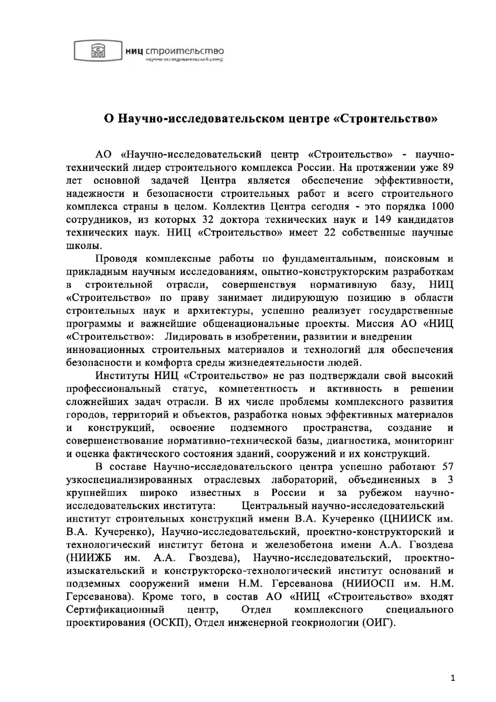 с т в о НЛуЧМО-МСМДСМЫ.ТГ.ПЫ:ННЙ цгмгр О Научно-исследовательском центре «Строительство» АО «Научно-исследовательский центр «Строительство» - научно- технический лидер строительного комплекса России. На протяжении уже 89 лет основной задачей Центра является обеспечение эффективности, надежности и безопасности строительных работ и всего строительного комплекса страны в целом. Коллектив Центра сегодня - это порядка 1000 сотрудников, из которых 32 доктора технических наук и 149 кандидатов технических наук. НИЦ «Строительство» имеет 22 собственные научные школы. Проводя комплексные работы по фундаментальным, поисковым и прикладным научным исследованиям, опытно-конструкторским разработкам в строительной отрасли, совершенствуя нормативную базу, НИЦ «Строительство» по праву занимает лидирующую позицию в области строительных наук и архитектуры, успешно реализует государственные программы и важнейшие общенациональные проекты. Миссия АО «НИЦ «Строительство»: Лидировать в изобретении, развитии и внедрении инновационных строительных материалов и технологий для обеспечения безопасности и комфорта среды жизнедеятельности людей. Институты НИЦ «Строительство» не раз подтверждали свой высокий профессиональный статус, компетентность и активность в решении сложнейших задач отрасли. В их числе проблемы комплексного развития городов, территорий и объектов, разработка новых эффективных материалов и конструкций, освоение подземного пространства, создание и совершенствование нормативно-технической базы, диагностика, мониторинг и оценка фактического состояния зданий, сооружений и их конструкций. В составе Научно-исследовательского центра успешно работают 57 узкоспециализированных отраслевых лабораторий, объединенных в 3 крупнейших широко известных в России и за рубежом научно- исследовательских института: Центральный научно-исследовательский институт строительных конструкций имени В.А. Кучеренко (ЦНИИСК им. В.А. Кучеренко), Научно-исследовательский, проектно-конструкторский и технологический институт бетона и железобетона имени А.А. Гвоздева (НИИЖБ им. А.А. Гвоздева), Научно-исследовательский, проектно­ изыскательский и конструкторско-технологический институт оснований и подземных сооружений имени Н.М. Герсеванова (НИИОСП им. Н.М. Герсеванова). Кроме того, в состав АО «НИЦ «Строительство» входят Сертификационный центр, Отдел комплексного специального проектирования (ОСКП), Отдел инженерной геокриологии (ОИГ). 1