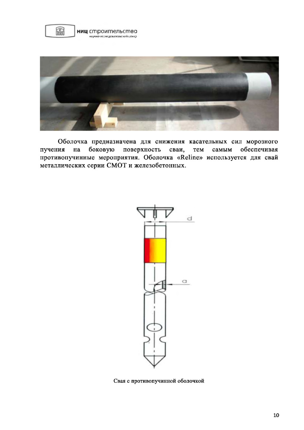 с т в о мдрчнсг-гас(Тедаплт«\пьоий цгнгр Оболочка предназначена для снижения касательных сил морозного пучения на боковую поверхность сваи, тем самым обеспечивая противопучинные мероприятия. Оболочка «Reline» используется для свай металлических серии СМОТ и железобетонных. Свая с противопучинной оболочкой 10