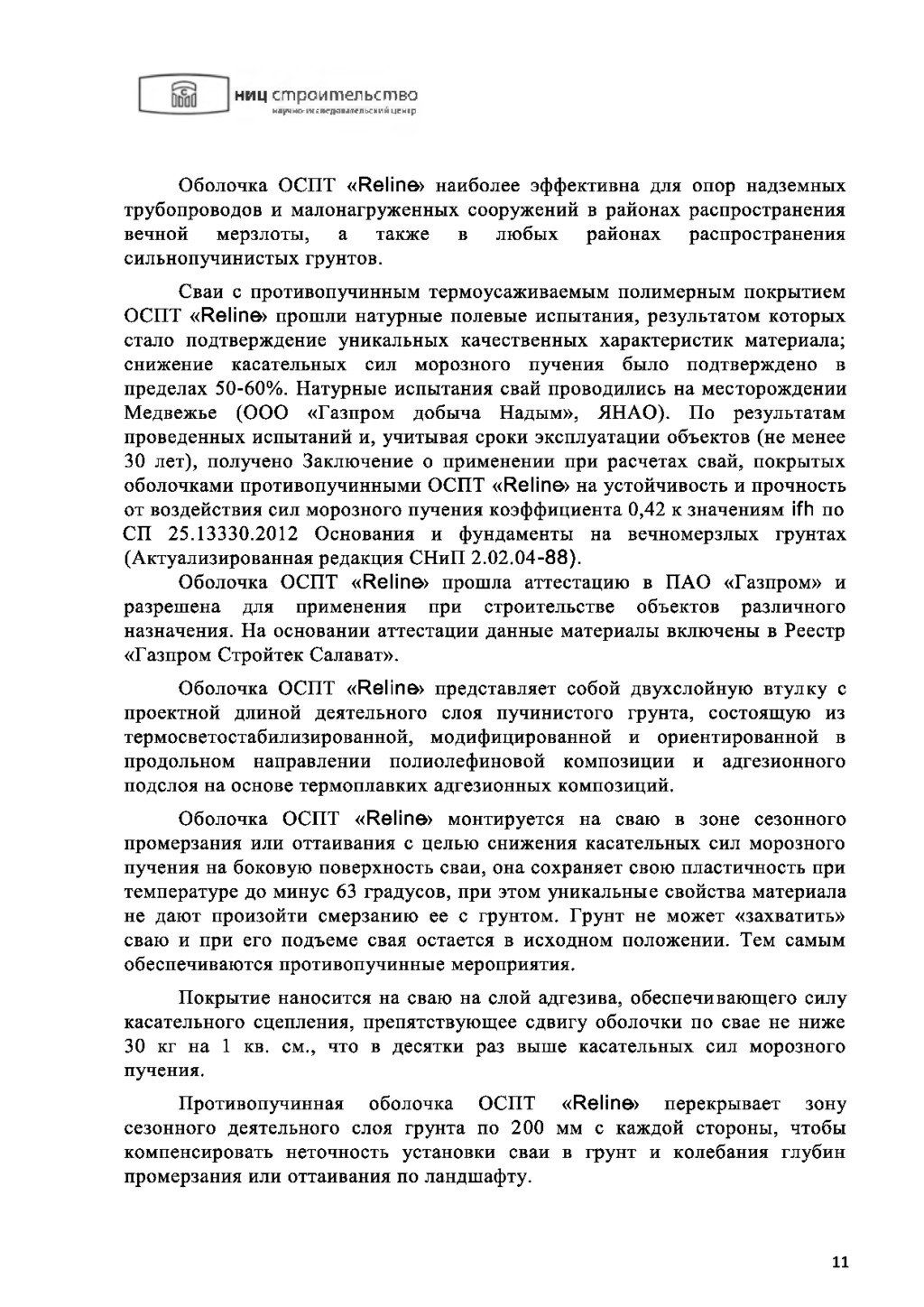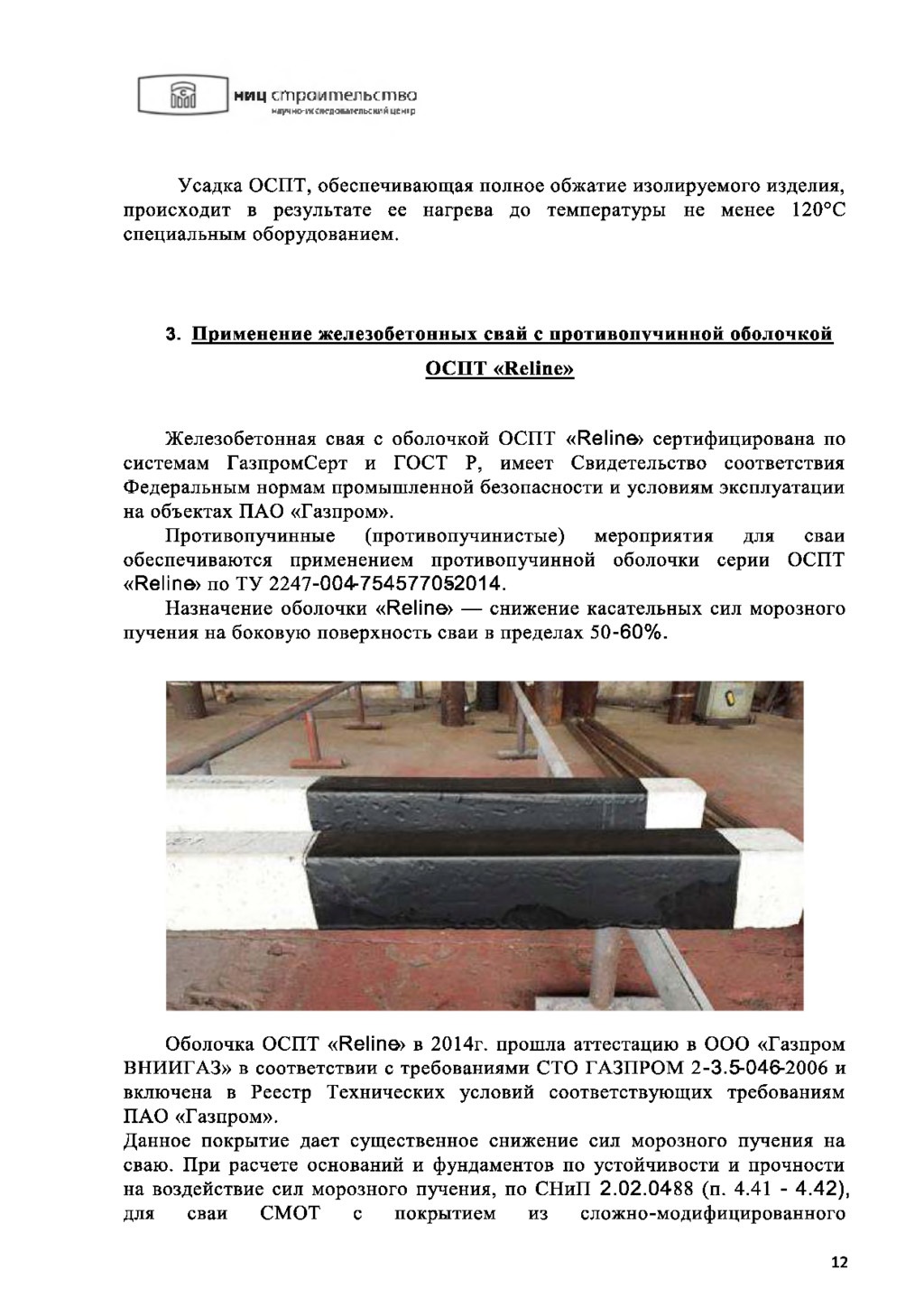 т в о Н1уЧ№ПС£ПГДООЛТГЛЬС1и1Й центр Усадка ОСПТ, обеспечивающая полное обжатие изолируемого изделия, происходит в результате ее нагрева до температуры не менее 120°С специальным оборудованием. 3. Применение железобетонных свай с противопучинной оболочкой ОСПТ «Reline» Железобетонная свая с оболочкой ОСПТ «Reline> сертифицирована по системам ГазпромСерт и ГОСТ Р, имеет Свидетельство соответствия Федеральным нормам промышленной безопасности и условиям эксплуатации на объектах ПАО «Газпром». Противопучинные (противопучинистые) мероприятия для сваи обеспечиваются применением противопучинной оболочки серии ОСПТ «Reline» по ТУ 2247-004-754577052014. Назначение оболочки «Reline> — снижение касательных сил морозного пучения на боковую поверхность сваи в пределах 50-60%. Оболочка ОСПТ «Relink в 2014г. прошла аттестацию в ООО «Газпром ВНИИГАЗ» в соответствии с требованиями СТО ГАЗПРОМ 2-3.5-046-2006 и включена в Реестр Технических условий соответствующих требованиям ПАО «Газпром». Данное покрытие дает существенное снижение сил морозного пучения на сваю. При расчете оснований и фундаментов по устойчивости и прочности на воздействие сил морозного пучения, по СНиП 2.02.0488 (п. 4.41 - 4.42), для сваи СМОТ с покрытием из сложно-модифицированного 12