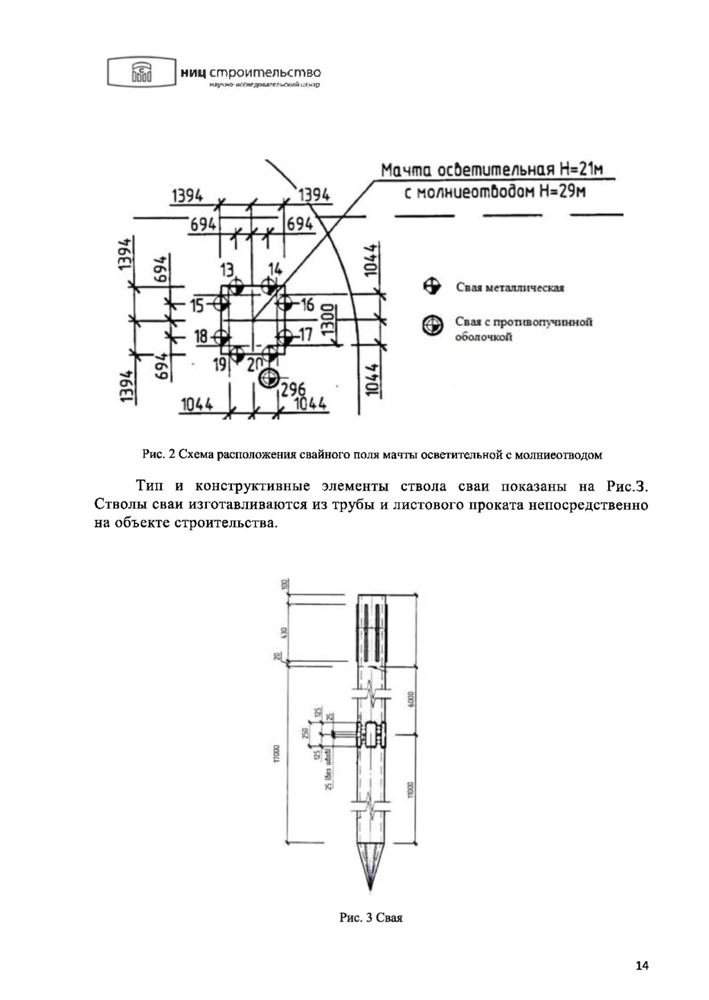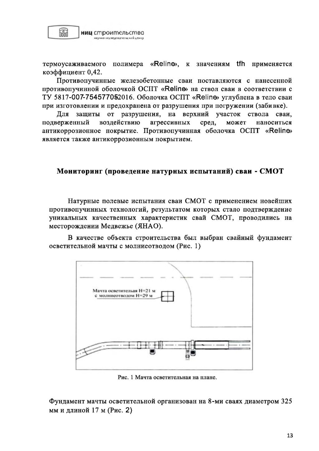 т в о научно- wc педопа тсльс^ий цсмгр термоусаживаемого полимера «Relin&>, к значениям tfh применяется коэффициент 0,42. Противопучинные железобетонные сваи поставляются с нанесенной противопучинной оболочкой ОСПТ «Relink на ствол сваи в соответствии с ТУ 5817-007-754577052016. Оболочка ОСПТ «Reline> углублена в тело сваи при изготовлении и предохранена от разрушения при погружении (забивке). Для защиты от разрушения, на верхний участок ствола сваи, подверженный воздействию агрессивных сред, может наноситься антикоррозионное покрытие. Противопучинная оболочка ОСПТ «Reline> является также антикоррозионным покрытием. Мониторинг (проведение натурных испытаний) сваи - СМОТ Натурные полевые испытания сваи СМОТ с применением новейших противопучинных технологий, результатом которых стало подтверждение уникальных качественных характеристик свай СМОТ, проводились на месторождении Медвежье (ЯНАО). В качестве объекта строительства был выбран свайный фундамент осветительной мачты с молниеотводом (Рис. 1) Фундамент мачты осветительной организован на 8-ми сваях диаметром 325 мм и длиной 17 м (Рис. 2) 13