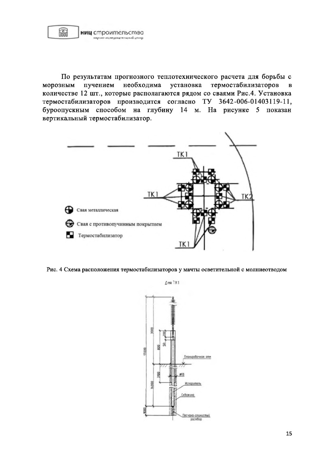с т в о нлуч№-№ с педаплтгльс^ий цсмгр По результатам прогнозного теплотехнического расчета для борьбы с морозным пучением необходима установка термостабилизаторов в количестве 12 шт., которые располагаются рядом со сваями Рис.4. Установка термостабилизаторов производится согласно ТУ 3642-006-01403119-11, буроопускным способом на глубину 14 м. На рисунке 5 показан вертикальный термостабилизатор. Рис. 4 Схема расположения термостабилизаторов у мачты осветительной с молниеотводом Jrw T K I 15