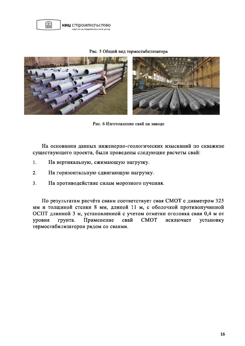 т в о НЛ^ЧНС'-^ЕСЛСДОНЛТСЛЬС^ИЙ цгнгр Рис. 5 Общий вид термостабилизатора Рис. 6 Изготовление свай на заводе На основании данных инженерно-геологических изысканий по скважине существующего проекта, были проведены следующие расчеты свай: 1. На вертикальную, сжимающую нагрузку. 2. На горизонтальную сдвигающую нагрузку. 3. На противодействие силам морозного пучения. По результатам расчёта сваям соответствует свая СМОТ с диаметром 325 мм и толщиной стенки 8 мм, длиной 11 м, с оболочкой противопучинной ОСПТ длинной 3 м, установленной с учетом отметки оголовка сваи 0,4 м от уровня грунта. Применение свай СМОТ исключает установку термостабилизаторов рядом со сваями. 16