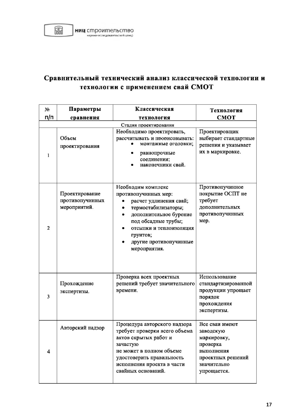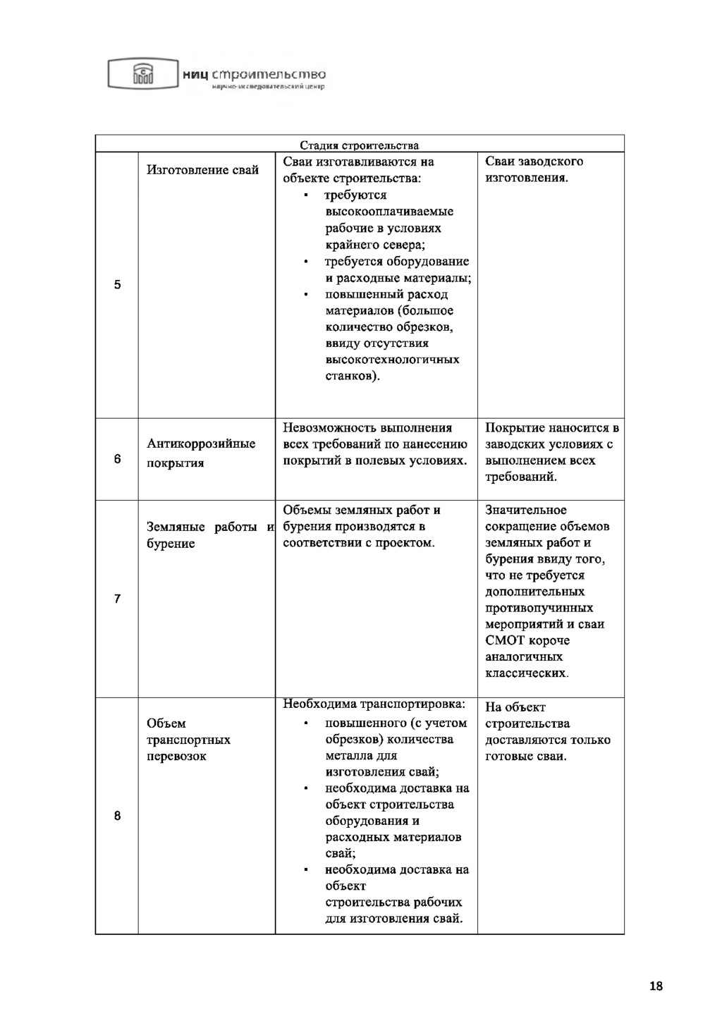 т в о НЛ^ЧНС'-^ЕСЛСДОНЛТСЛЬС^ИЙ цгнгр Стадия строительства 5 Изготовление свай Сваи изготавливаются на объекте строительства: • требуются высокооплачиваемые рабочие в условиях крайнего севера; • требуется оборудование и расходные материалы; • повышенный расход материалов (большое количество обрезков, ввиду отсутствия высокотехнологичных станков). Сваи заводского изготовления. 6 Антикоррозийные покрытия Невозможность выполнения всех требований по нанесению покрытий в полевых условиях. Покрытие наносится в заводских условиях с выполнением всех требований. 7 Земляные работы и бурение Объемы земляных работ и бурения производятся в соответствии с проектом. Значительное сокращение объемов земляных работ и бурения ввиду того, что не требуется дополнительных противопучинных мероприятий и сваи СМОТ короче аналогичных классических. 8 Объем транспортных перевозок Необходима транспортировка: • повышенного (с учетом обрезков) количества металла для изготовления свай; • необходима доставка на объект строительства оборудования и расходных материалов свай; • необходима доставка на объект строительства рабочих для изготовления свай. На объект строительства доставляются только готовые сваи. 18