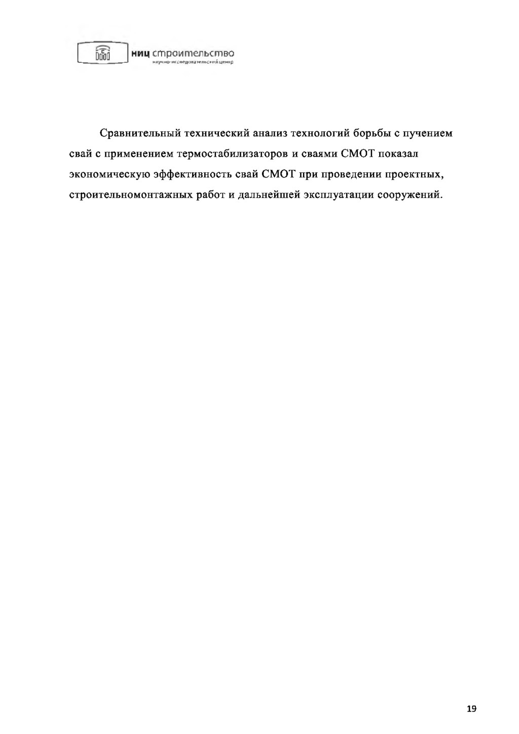 ь с т в о н л у ч м о - и с с л т д а и л т с л ь с р в и й ц р м г р Сравнительный технический анализ технологий борьбы с пучением свай с применением термостабилизаторов и сваями СМОТ показал экономическую эффективность свай СМОТ при проведении проектных, строительномонтажных работ и дальнейшей эксплуатации сооружений. 19
