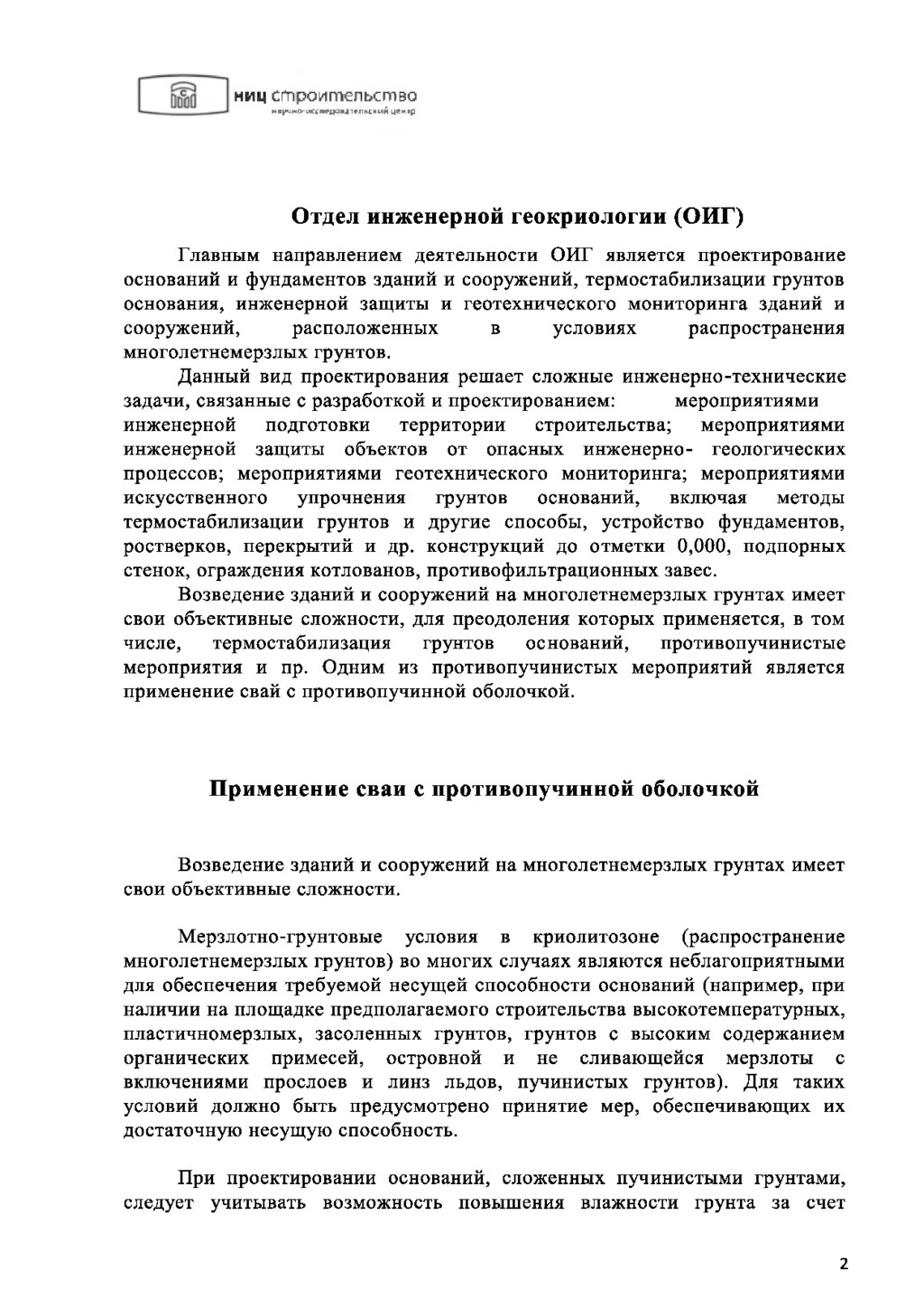 с т в о нл^чно-мслгданлти'льс^ий центр Отдел инженерной геокриологии (ОИГ) Главным направлением деятельности ОИГ является проектирование оснований и фундаментов зданий и сооружений, термостабилизации грунтов основания, инженерной защиты и геотехнического мониторинга зданий и сооружений, расположенных в условиях распространения многолетнемерзлых грунтов. Данный вид проектирования решает сложные инженерно-технические задачи, связанные с разработкой и проектированием: мероприятиями инженерной подготовки территории строительства; мероприятиями инженерной защиты объектов от опасных инженерно- геологических процессов; мероприятиями геотехнического мониторинга; мероприятиями искусственного упрочнения грунтов оснований, включая методы термостабилизации грунтов и другие способы, устройство фундаментов, ростверков, перекрытий и др. конструкций до отметки 0,000, подпорных стенок, ограждения котлованов, противофильтрационных завес. Возведение зданий и сооружений на многолетнемерзлых грунтах имеет свои объективные сложности, для преодоления которых применяется, в том числе, термостабилизация грунтов оснований, противопучинистые мероприятия и пр. Одним из противопучинистых мероприятий является применение свай с противопучинной оболочкой. Применение сваи с противопучинной оболочкой Возведение зданий и сооружений на многолетнемерзлых грунтах имеет свои объективные сложности. Мерзлотно-грунтовые условия в криолитозоне (распространение многолетнемерзлых грунтов) во многих случаях являются неблагоприятными для обеспечения требуемой несущей способности оснований (например, при наличии на площадке предполагаемого строительства высокотемпературных, пластичномерзлых, засоленных грунтов, грунтов с высоким содержанием органических примесей, островной и не сливающейся мерзлоты с включениями прослоев и линз льдов, пучинистых грунтов). Для таких условий должно быть предусмотрено принятие мер, обеспечивающих их достаточную несущую способность. При проектировании оснований, сложенных пучинистыми грунтами, следует учитывать возможность повышения влажности грунта за счет 2