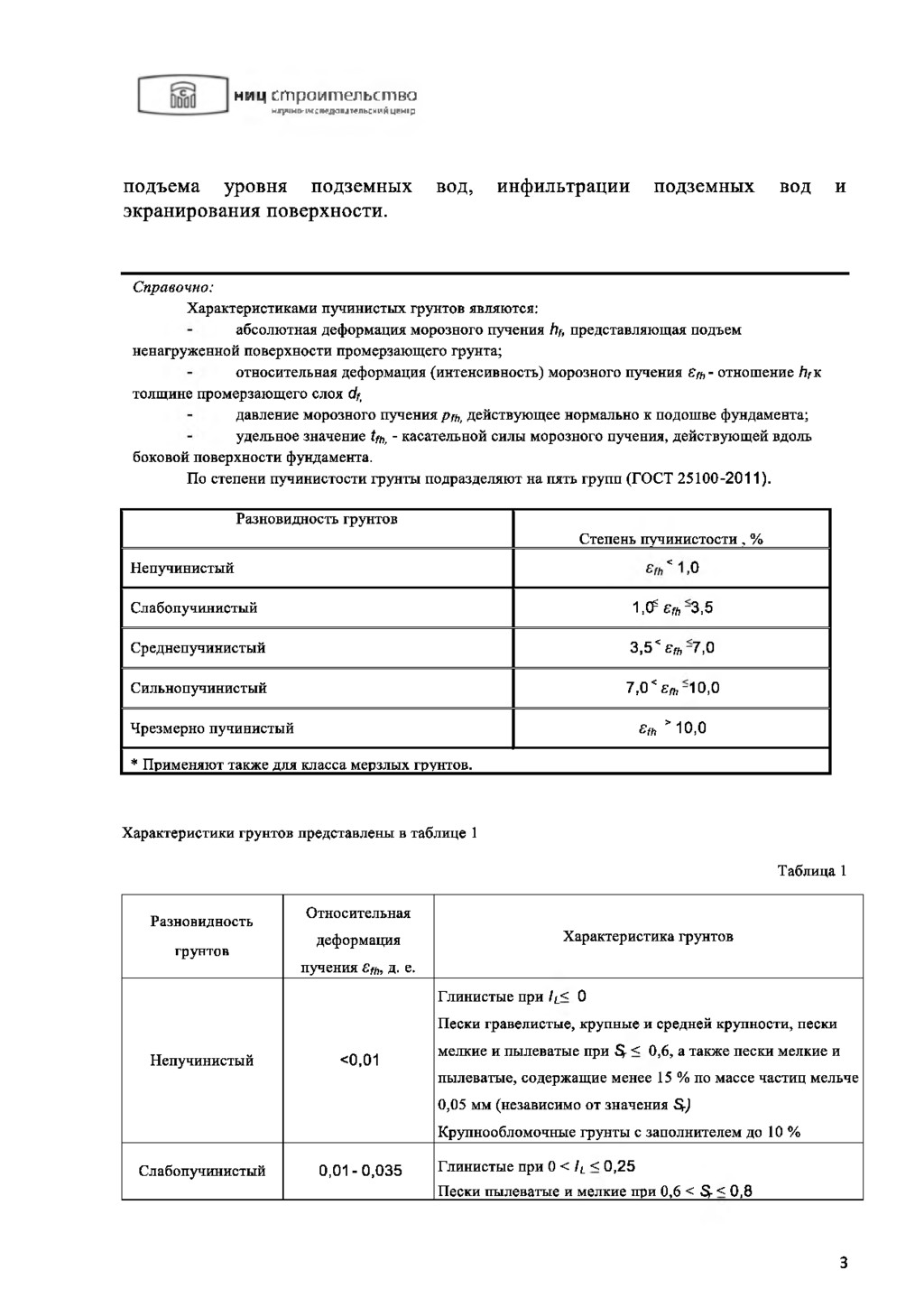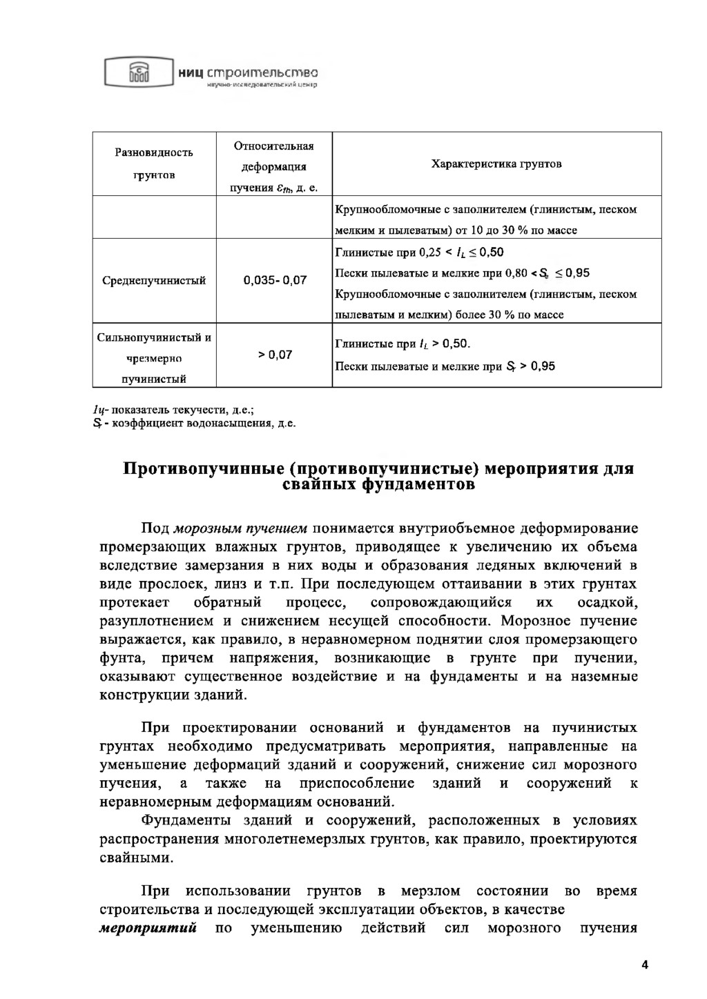 с т в о нлучнс>-мс леданлтельсний цгнгр подъема уровня подземных вод, инфильтрации подземных вод и экранирования поверхности. Справочно: Характеристиками пучинистых грунтов являются: абсолютная деформация морозного пучения hf, представляющая подъем ненагруженной поверхности промерзающего грунта; относительная деформация (интенсивность) морозного пучения Eft, - отношение hf к толщине промерзающего слоя df: давление морозного пучения pfh, действующее нормально к подошве фундамента; удельное значение tfh, - касательной силы морозного пучения, действующей вдоль боковой поверхности фундамента. По степени пучинистости грунты подразделяют на пять групп (ГОСТ 25100-2011). Разновидность грунтов Степень пучинистости , % Непучинистый Л О Слабопучинистый 1 ,0 ^ - 3 , 5 Среднепучинистый 3,5 < Sfh~7,0 Сильнопучинистый 7,0* Efh ~10,0 Чрезмерно пучинистый Efh > 10,0 * Применяют также для класса мерзлых грунтов. Характеристики грунтов представлены в таблице 1 Таблица 1 Разновидность грунтов Относительная деформация пучения Е^, д. е. Характеристика грунтов Непучинистый <0,01 Глинистые при //_< 0 Пески гравелистые, крупные и средней крупности, пески мелкие и пылеватые при S}- < 0,6, а также пески мелкие и пылеватые, содержащие менее 15 % по массе частиц мельче 0,05 мм (независимо от значения Sr) Крупнообломочные грунты с заполнителем до 10 % Слабопучинистый 0,01-0,035 Глинистые при 0 < //. < 0,25 Пески пылеватые и мелкие при 0,6 < S J- < 0,8 3