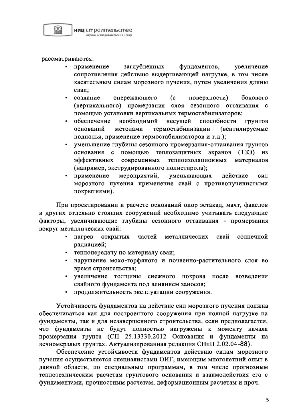 с т в о Н Л у Ч № - № С Л Г Д О П Д Т 1 'Л Ь С 1 в И Й Ц Г Н ф рассматриваются: • применение заглубленных фундаментов, увеличение сопротивления действию выдергивающей нагрузке, в том числе касательным силам морозного пучения, путем увеличения длины сваи; • создание опережающего (с поверхности) бокового (вертикального) промерзания слоя сезонного оттаивания с помощью установки вертикальных термостабилизаторов; • обеспечение необходимой несущей способности грунтов оснований методами термостабилизации (вентилируемые подполья, применение термостабилизаторов и т.д.); • уменьшение глубины сезонного промерзания-оттаивания грунтов основания с помощью теплозащитных экранов (ТЗЭ) из эффективных современных теплоизоляционных материалов (например, экструдированного полистирола); • применение мероприятий, уменьшающих действие сил морозного пучения применение свай с противопучинистыми покрытиями). При проектировании и расчете оснований опор эстакад, мачт, факелов и других отдельно стоящих сооружений необходимо учитывать следующие факторы, увеличивающие глубины сезонного оттаивания - промерзания вокруг металлических свай: • нагрев открытых частей металлических свай солнечной радиацией; • теплопередачу по материалу сваи; • нарушение мохо-торфяного и почвенно-растительного слоя во время строительства; • увеличение толщины снежного покрова после возведения свайного фундамента под влиянием заносов; • продолжительность эксплуатации сооружения. Устойчивость фундаментов на действие сил морозного пучения должна обеспечиваться как для построенного сооружения при полной нагрузке на фундаменты, так и для незавершенного строительства, если предполагается, что фундаменты не будут полностью нагружены к моменту начала промерзания грунта (СП 25.13330.2012 Основания и фундаменты на вечномерзлых грунтах. Актуализированная редакция СНиП 2.02.04-88). Обеспечение устойчивости фундаментов действию силам морозного пучения осуществляется специалистами ОИГ, имеющим многолетний опыт в данной области, по специальным программам, в том числе прогнозным теплотехническим расчетам грунтового основания и взаимодействия его с фундаментами, прочностным расчетам, деформационным расчетам и проч. 5