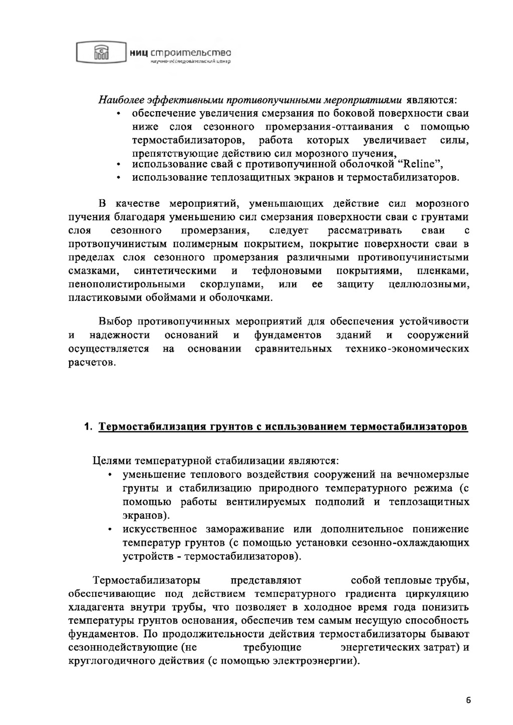 с т в о н1уч№иССпгдооЗ|ТГЛьсний центр Наиболее эффективными противопучинными мероприятиями являются: • обеспечение увеличения смерзания по боковой поверхности сваи ниже слоя сезонного промерзания-оттаивания с помощью термостабилизаторов, работа которых увеличивает силы, препятствующие действию сил морозного пучения, • использование свай с противопучинной оболочкой “Reline”, • использование теплозащитных экранов и термостабилизаторов. В качестве мероприятий, уменьшающих действие сил морозного пучения благодаря уменьшению сил смерзания поверхности сваи с грунтами слоя сезонного промерзания, следует рассматривать сваи с протвопучинистым полимерным покрытием, покрытие поверхности сваи в пределах слоя сезонного промерзания различными противопучинистыми смазками, синтетическими и тефлоновыми покрытиями, пленками, пенополистирольными скорлупами, или ее защиту целлюлозными, пластиковыми обоймами и оболочками. Выбор противопучинных мероприятий для обеспечения устойчивости и надежности оснований и фундаментов зданий и сооружений осуществляется на основании сравнительных технике-экономических расчетов. 1. Термостабилизация грунтов с испльзованием термостабилизаторов Целями температурной стабилизации являются: • уменьшение теплового воздействия сооружений на вечномерзлые грунты и стабилизацию природного температурного режима (с помощью работы вентилируемых подполий и теплозащитных экранов). • искусственное замораживание или дополнительное понижение температур грунтов (с помощью установки сезонно-охлаждающих устройств - термостабилизаторов). Термостабилизаторы представляют собой тепловые трубы, обеспечивающие под действием температурного градиента циркуляцию хладагента внутри трубы, что позволяет в холодное время года понизить температуры грунтов основания, обеспечив тем самым несущую способность фундаментов. По продолжительности действия термостабилизаторы бывают сезоннодействующие (не требующие энергетических затрат) и круглогодичного действия (с помощью электроэнергии). 6