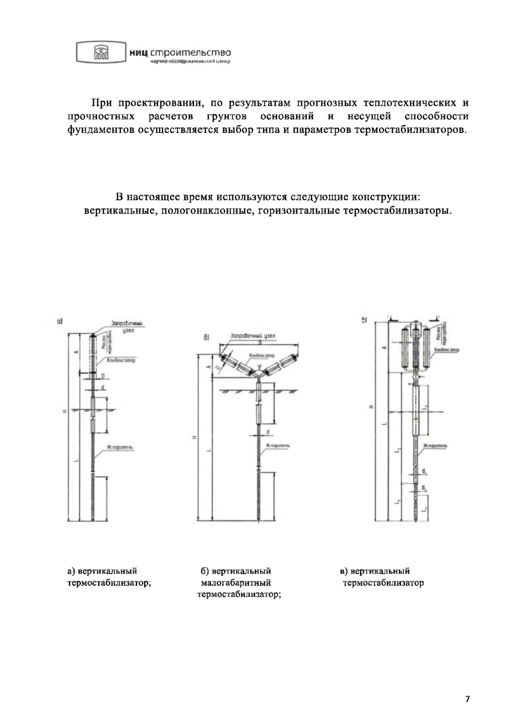 с т в о н л доп л тульский- цгнгр При проектировании, по результатам прогнозных теплотехнических и прочностных расчетов грунтов оснований и несущей способности фундаментов осуществляется выбор типа и параметров термостабилизаторов. В настоящее время используются следующие конструкции: вертикальные, пологонаклонные, горизонтальные термостабилизаторы. ЭопрпЬ очный 6 1 а) вертикальный термостабилизатор; б) вертикальный малогабаритный термостабилизатор; в) вертикальный термостабилизатор 7