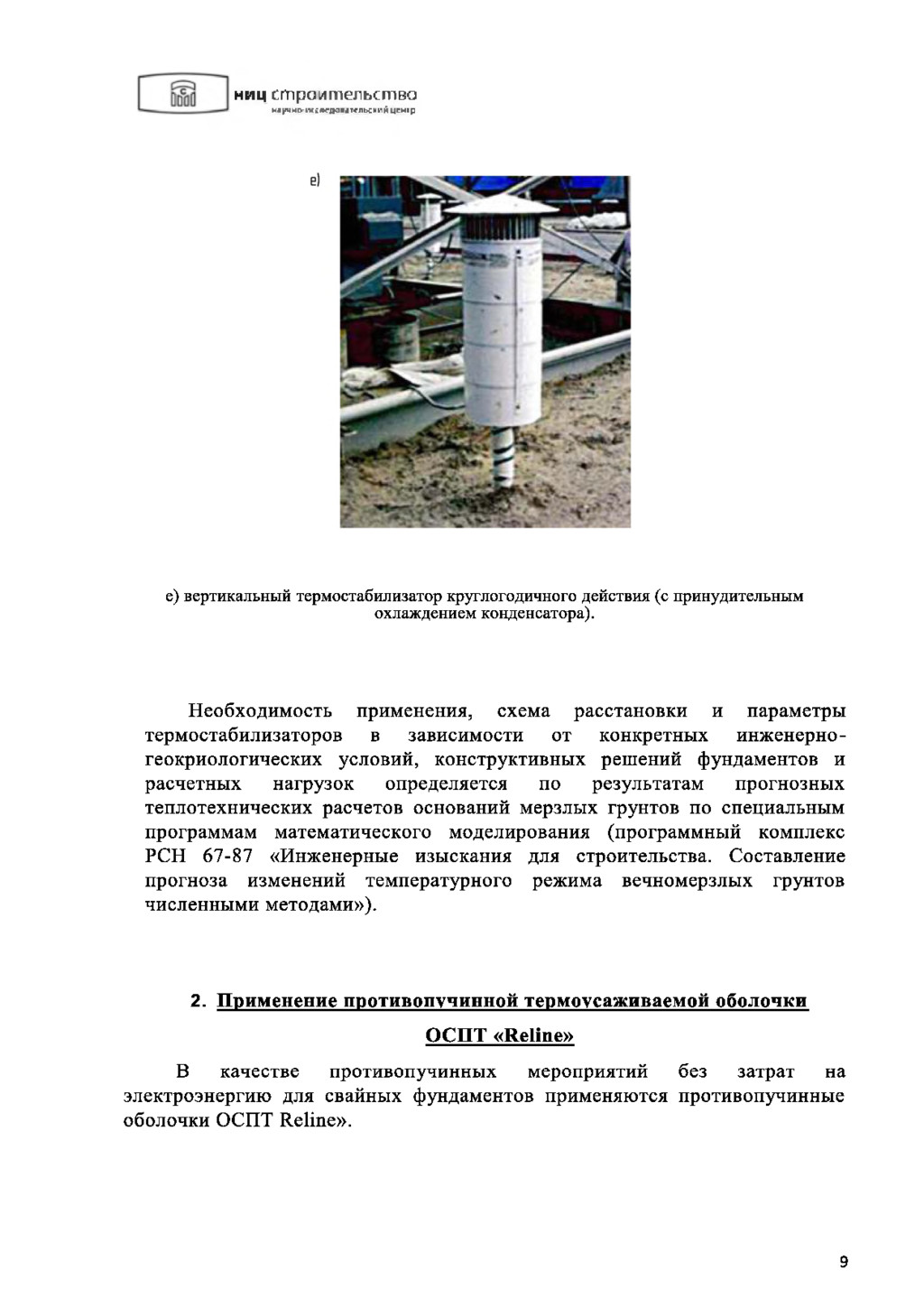 принудительным охлаждением конденсатора). Необходимость применения, схема расстановки и параметры термостабилизаторов в зависимости от конкретных инженерно- геокриологических условий, конструктивных решений фундаментов и расчетных нагрузок определяется по результатам прогнозных теплотехнических расчетов оснований мерзлых грунтов по специальным программам математического моделирования (программный комплекс РСН 67-87 «Инженерные изыскания для строительства. Составление прогноза изменений температурного режима вечномерзлых грунтов численными методами»). 2. Применение противопучинной термоусаживаемой оболочки ОСПТ «Reline» В качестве противопучинных мероприятий без затрат на электроэнергию для свайных фундаментов применяются противопучинные оболочки ОСПТ Reline». 9