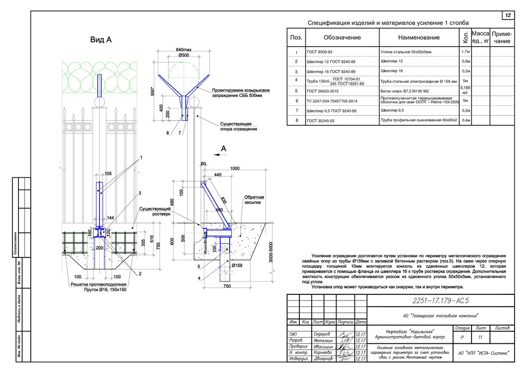 7 3 4 Разрез 1-1 -0,500 Крепление скоб (1:4) Б Последующие Верхняя 60* Б Б-Б 1 (2) 60* 60* 3 4 6 0,000 -0,500 140 140 1 Разрез 4-4 +2,070** Ось заграждения 1 Разрез 2-2 Ø159 1000** 500** 8 5(9) 0,000 -0,500 -5,000 1 2 3 4 10 1 25 Согласовано Взам. инв. № Подпись и дата Инв. № подл. М 1:20 Ограждение локальной зоны 1 3 5 6 7 8 9 10 11 2 4 Fensys, РФ Fensys, РФ Fensys, РФ Fensys, РФ Панель сварная 2030x3000 пруток Ø8мм ячейка 50х150мм Столб ограждения 80х80х3мм, H=2,07м Заглушка пластиковая для столба Скоба монтажная Труба электросварная Ø159х5мм Профиль стальной 140х140х5мм ГОСТ 26633-2015 Лист стальной, толщина 5мм Бетон класс B7,5 M100 W2 Профиль 140x140x5 ГОСТ 30245-2003 Cт245 ГОСТ 27772-88 ГОСТ 10704-91 Лист 5 ГОСТ 19903-74 345 ГОСТ19281-89 80х120мм Обозначение Наименование Кол. Приме- чание Поз. Масса ед., кг Спецификация изделий и материалов на 6м ограждения Мастика битумно-резиновая изоляционная МБР-65 ГОСТ 15836-79 Цинол Лакокрасочное покрытие Противопучинистая термоусаживаемая оболочка для сваи ОСПТ – «Reline» на 1 сваю на 2 сваи на 2 сваи на 1 сваю ТУ 2247-004-75457705-2014