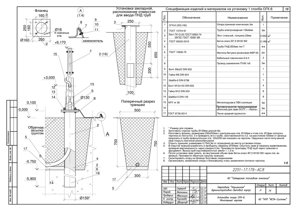5 15 5 14 Обратная засыпка грунтом 300 750 500 Поперечный разрез траншеи 700 250 250 160 160 Ø16 4 сквозных отв. Фланец 3 2 Ø160 Ø130 200 100 550 650 Установка закладной, расположение отверстия для ввода ПНД труб 250 1. * Размер для справок. 2. Заготовить отрезок трубы Ø159мм длиной 6м. 3. Изготовить фланец, размерами 250х250мм с центральным отв. Ø160мм и 4-мя отв. Ø16мм согласно чертежа из листа поз. 3 и приварить его к трубе, заготовленной по п.2. на расстоянии 550мм от фланца прорезать в трубе прямоугольное отв. 100х200 как показано на чертеже. Наружные части полученной сваи покрыть мастикой резинобитумной. 4. Отрыть траншею, размерами 0,75х0,3м от ограждения до места установки опоры. 5. В отрытой траншее разметить и пробурить скважину Ø160мм. Опустить сваю в скважину вдавливанием, проверяя вертикальность через каждые 0,5м. Произвести прокладку ПНД труб через траншею и фундамент. Выход труб над поверхностью земли 1..1,5 м 6. После установки сваи залить во внутренний объем сваи бетон класс B7,5 M100 W2 через отв. во фланце. Произвести обратную засыпку траншеи. 7. Смонтировать опору на фланце болтовым соединением 8. Организовать заземление опоры к ближайшему очагу заземления согласно чертежа. Согласовано Взам. инв. № Подпись и дата Инв. № подл. 1:5 1 1 3 2 Обозначение Поз. Примечание Наименование Кол. Опора граненая коническая, 6м Бетон класс B7,5 M100 W2 ГОСТ 26633-2015 0,188 4 5 ОГК-6 (250,160) 6 7 8 9 10 11 2кг Мастика битумно-резиновая МБР-65 2 Кабельный наконечник 6-6-4 5м Провод заземления ПУгВ 1х6 1 1 1 Труба ПНД Ø50мм тип Т ** 5м Металлорукав в ПВХ изоляции 13 9 10 11 заземлитель 7 (1:4) 8 А А Гайка М6 DIN 934 Болт М6х20 DIN 933 Шайба 6 DIN 6798 ГОСТ 15836-79 МПГ нг 38 Труба электросварная 159х6мм ГОСТ 10704-91 6м 12 14 15 16 Гайка М12 DIN 934 Болт М12х100 DIN 933 Шайба12 DIN 125 Лист стальной, толшина 20мм Лист ПУ-О-20 ГОСТ19903-74 09Г2С ГОСТ 19281-89 0,062 8 4 8 оболочка для сваи ОСПТ – «Reline» 6м 4 12 13 14 15 17 2 6 16 Спецификация изделий и материалов на установку 1 столба ОГК-6 м2 м3 2 (16) 3 15 17 ** ГОСТ 8736-2014 Песок средней крупности 17 5 5