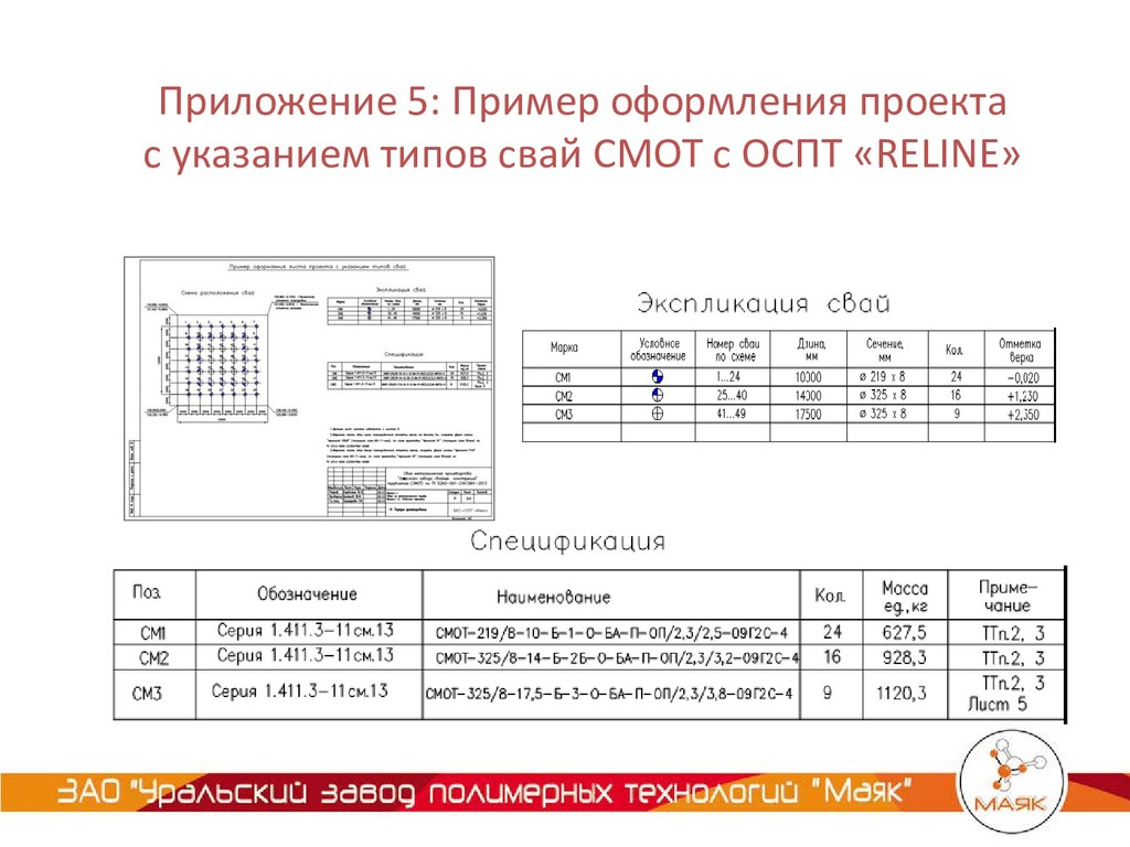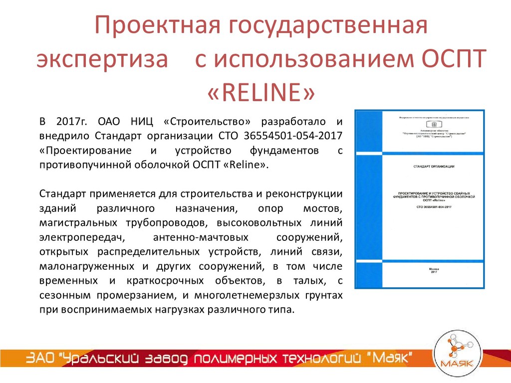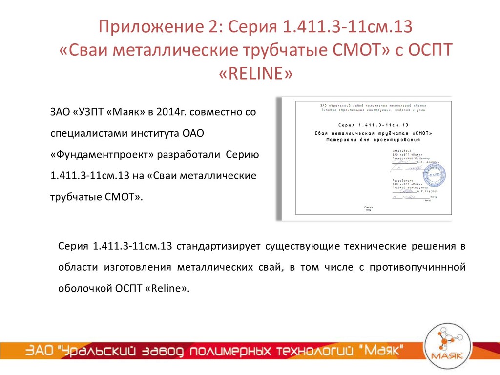 «RELINE» ЗАО «УЗПТ «Маяк» в 2014г. совместно со специалистами института ОАО «Фундаментпроект» разработали Серию 1.411.3-11см.13 на «Сваи металлические трубчатые СМОТ». Серия 1.411.3-11см.13 стандартизирует существующие технические решения в области изготовления металлических свай, в том числе с противопучиннной оболочкой ОСПТ «Reline».