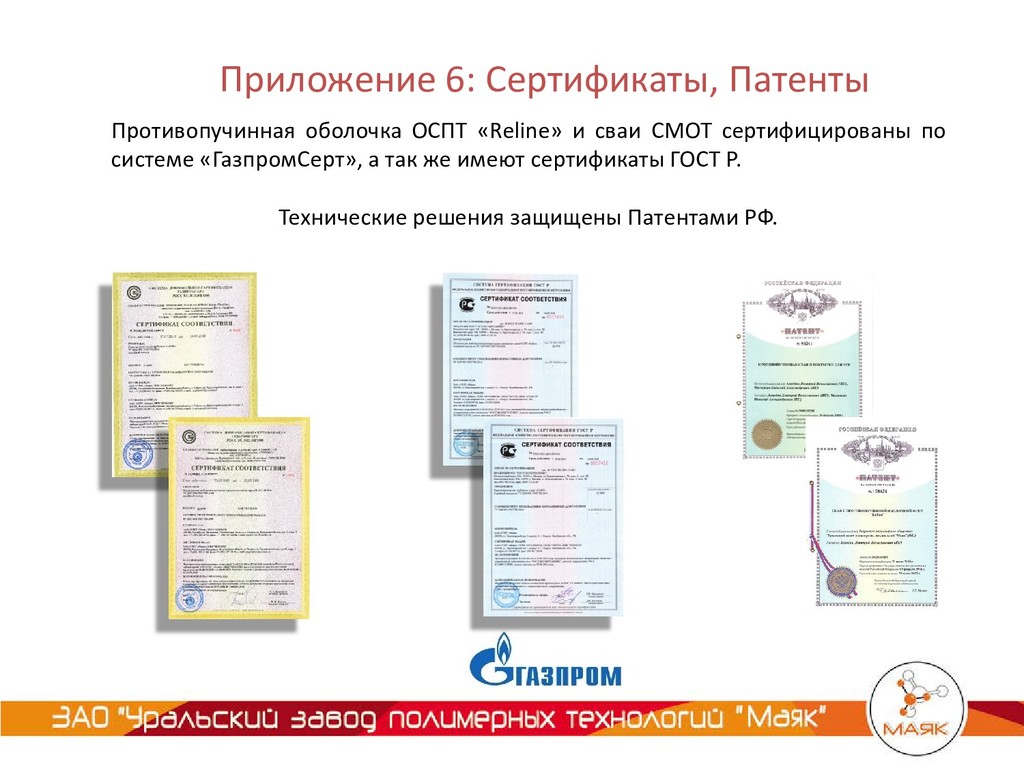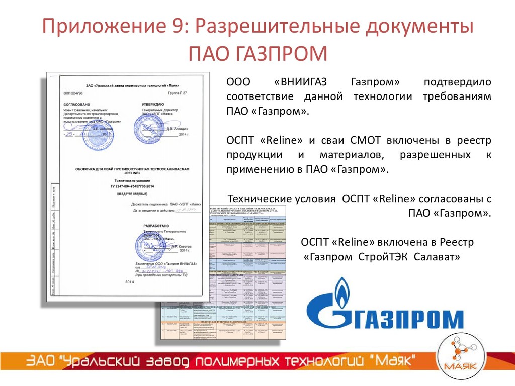 соответствие данной технологии требованиям ПАО «Газпром». ОСПТ «Reline» и сваи СМОТ включены в реестр продукции и материалов, разрешенных к применению в ПАО «Газпром». Технические условия ОСПТ «Reline» согласованы с ПАО «Газпром». ОСПТ «Reline» включена в Реестр «Газпром СтройТЭК Салават»