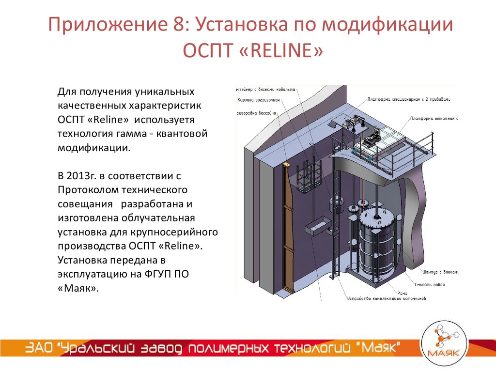 - квантовой модификации. В 2013г. в соответствии с Протоколом технического совещания разработана и изготовлена облучательная установка для крупносерийного производства ОСПТ «Reline». Установка передана в эксплуатацию на ФГУП ПО «Маяк». Приложение 8: Установка по модификации ОСПТ «RELINE»