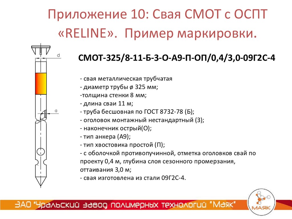 -толщина стенки 8 мм; - длина сваи 11 м; - труба бесшовная по ГОСТ 8732-78 (Б); - оголовок монтажный нестандартный (З); - наконечник острый(О); - тип анкера (А9); - тип хвостовика простой (П); - с оболочкой противопучинной, отметка оголовков свай по проекту 0,4 м, глубина слоя сезонного промерзания, оттаивания 3,0 м; - свая изготовлена из стали 09Г2С-4. СМОТ-325/8-11-Б-3-О-А9-П-ОП/0,4/3,0-09Г2С-4 Приложение 10: Свая СМОТ с ОСПТ «RELINE». Пример маркировки.