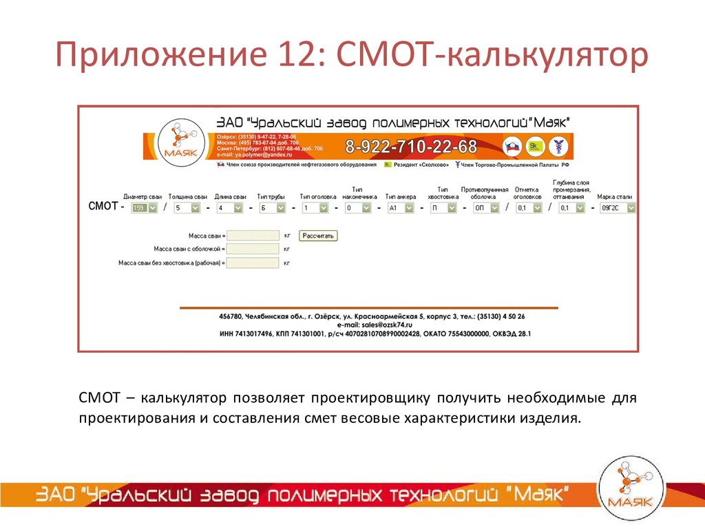 19. Приложение 12: СМОТ-калькулятор СМОТ – калькулятор позволяет проектировщику получить необходимые