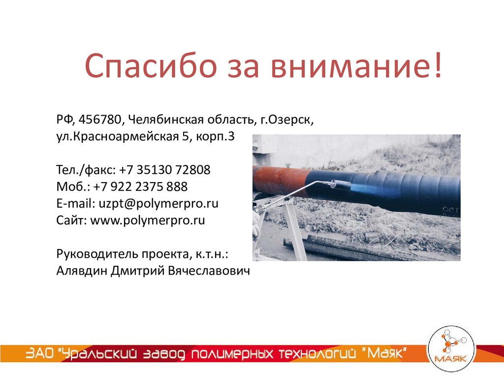 35130 72808 Моб.: +7 922 2375 888 Е-mail: [email protected] Сайт: www.polymerpro.ru Руководитель проекта, к.т.н.: Алявдин Дмитрий Вячеславович Спасибо за внимание!