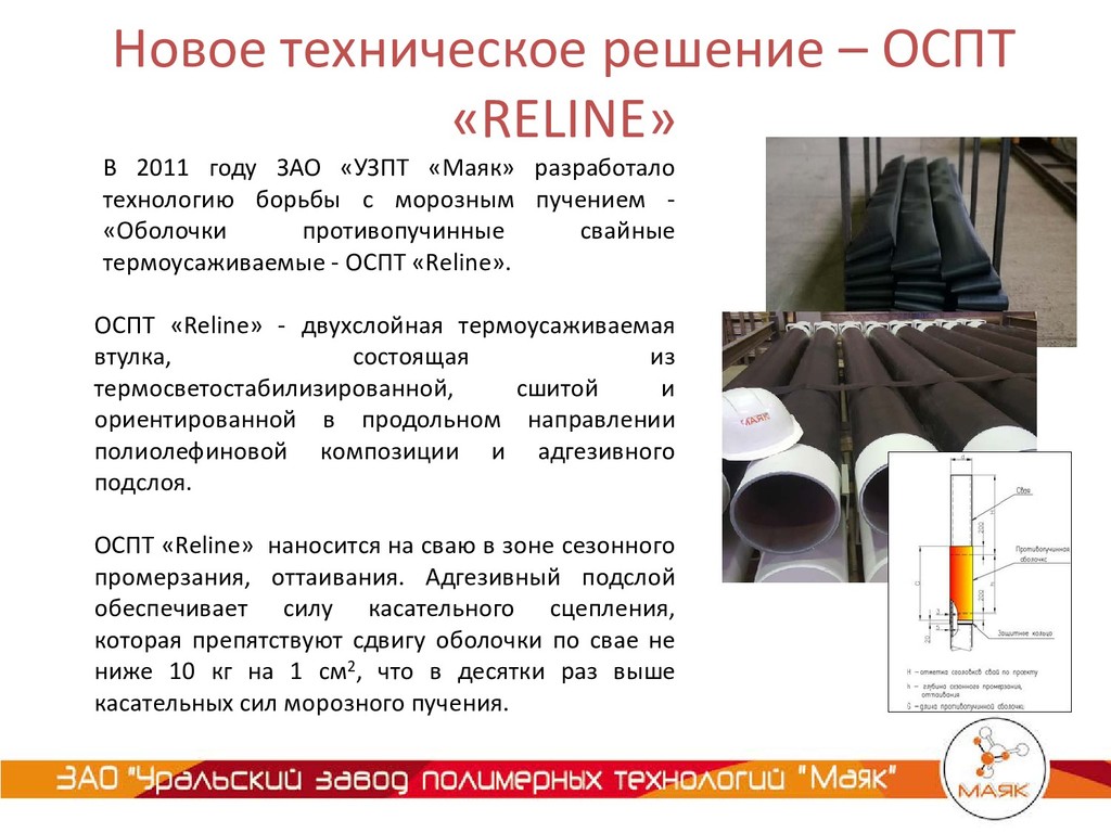 «УЗПТ «Маяк» разработало технологию борьбы с морозным пучением - «Оболочки противопучинные свайные термоусаживаемые - ОСПТ «Reline». ОСПТ «Reline» - двухслойная термоусаживаемая втулка, состоящая из термосветостабилизированной, сшитой и ориентированной в продольном направлении полиолефиновой композиции и адгезивного подслоя. ОСПТ «Reline» наносится на сваю в зоне сезонного промерзания, оттаивания. Адгезивный подслой обеспечивает силу касательного сцепления, которая препятствуют сдвигу оболочки по свае не ниже 10 кг на 1 см2, что в десятки раз выше касательных сил морозного пучения.