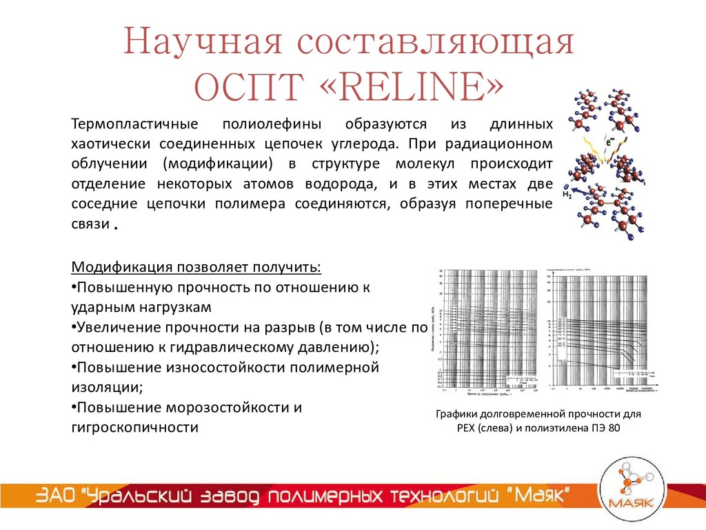 и полиэтилена ПЭ 80 Термопластичные полиолефины образуются из длинных хаотически соединенных цепочек углерода. При радиационном облучении (модификации) в структуре молекул происходит отделение некоторых атомов водорода, и в этих местах две соседние цепочки полимера соединяются, образуя поперечные связи . Модификация позволяет получить: •Повышенную прочность по отношению к ударным нагрузкам •Увеличение прочности на разрыв (в том числе по отношению к гидравлическому давлению); •Повышение износостойкости полимерной изоляции; •Повышение морозостойкости и гигроскопичности