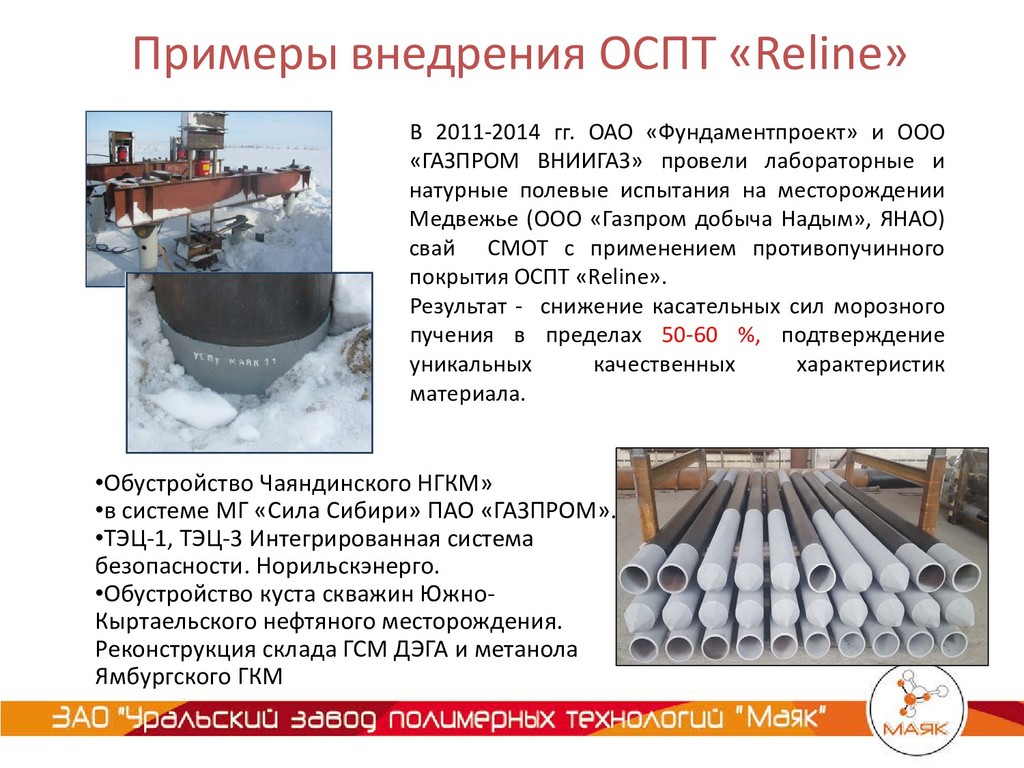 ООО «ГАЗПРОМ ВНИИГАЗ» провели лабораторные и натурные полевые испытания на месторождении Медвежье (ООО «Газпром добыча Надым», ЯНАО) свай СМОТ с применением противопучинного покрытия ОСПТ «Reline». Результат - снижение касательных сил морозного пучения в пределах 50-60 %, подтверждение уникальных качественных характеристик материала. •Обустройство Чаяндинского НГКМ» •в системе МГ «Сила Сибири» ПАО «ГАЗПРОМ». •ТЭЦ-1, ТЭЦ-3 Интегрированная система безопасности. Норильскэнерго. •Обустройство куста скважин Южно- Кыртаельского нефтяного месторождения. Реконструкция склада ГСМ ДЭГА и метанола Ямбургского ГКМ