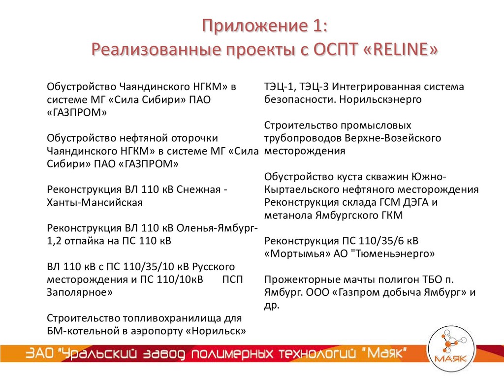 Обустройство нефтяной оторочки Чаяндинского НГКМ» в системе МГ «Сила Сибири» ПАО «ГАЗПРОМ» Реконструкция ВЛ 110 кВ Снежная - Ханты-Мансийская Реконструкция ВЛ 110 кВ Оленья-Ямбург- 1,2 отпайка на ПС 110 кВ ВЛ 110 кВ с ПС 110/35/10 кВ Русского месторождения и ПС 110/10кВ ПСП Заполярное» Строительство топливохранилища для БМ-котельной в аэропорту «Норильск» ТЭЦ-1, ТЭЦ-3 Интегрированная система безопасности. Норильскэнерго Строительство промысловых трубопроводов Верхне-Возейского месторождения Обустройство куста скважин Южно- Кыртаельского нефтяного месторождения Реконструкция склада ГСМ ДЭГА и метанола Ямбургского ГКМ Реконструкция ПС 110/35/6 кВ «Мортымья» АО "Тюменьэнерго» Прожекторные мачты полигон ТБО п. Ямбург. ООО «Газпром добыча Ямбург» и др. Приложение 1: Реализованные проекты с ОСПТ «RELINE»
