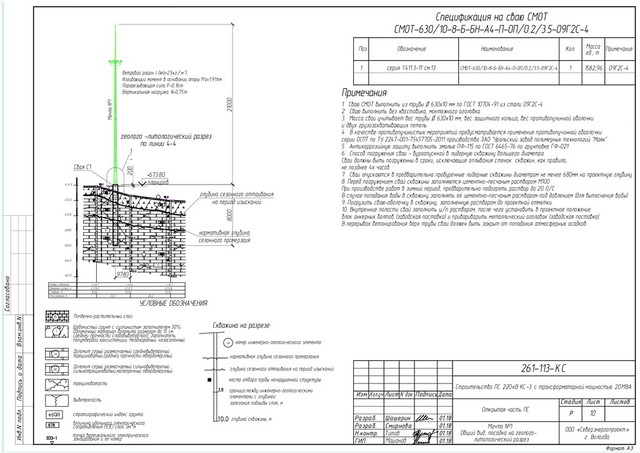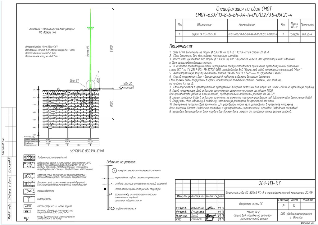N док. Кол.уч Изм. Лист ПодписьДата Стадия Листов Лист Р ГИП Н.контр. Разраб. Строительство ПС 220кВ КС-3 с трансформаторной мощностью 20МВА 261-113-КC Открытая часть ПС ООО «Северэнергопроект» г. Вологда Шашерин Машанов Титов Разраб. Смирнова 01.18 01.18 01.18 01.18 Мачта №1 Общий вид, посадка на геолого- Номеp скважины Отметка устья, м Глубина, м Расстояние, м геолого -литологический разрез по линии 4-4 664.0 666.0 668.0 670.0 672.0 674.0 c-пс1 10.00 673.93 22.2 c-пс7 10.00 672.05 c-пс4 10.00 672.71 26.3 662.0 * * * * * * * * * * * * * * * * * * * * * * * * 4м Є 1 * * * * * * * * * * * * * * * * * * * * * * * * * 1м 4м 6м * * * * * * * * * * * * * * * * * * * * * * * П П еdQIII 6м Є 1 1.2 4.5 1.7 5.4 9780 +673.80 планиров 200 Ветровой район I (Wo=23кг/м²) Изгибающий момент в основании опоры Мo=1,91тм Перерезывающая сила Р=0,16т Вертикальная нагрузка N=0,75т 8000 Мачта №1 21000 УСЛОВНЫЕ ОБОЗНАЧЕНИЯ: Почвенно-растительный слой П Щебенистый грунт с суглинистым заполнителем 30% Обломочный материал доломита размером до 15 см. 1 Доломит серый размягчаемый средневыветрелый трещиноватый,средней прочности твердомерзлый 4м Доломит серый размягчаемый сильновыветрелый сильнотрещиноватый,малопрочный твердомерзлый 6м Скважина на разрезе: глубина скважины, м. место отбора пробы ненарушенной структуры номер инженерно-геологического элемента граница между инженерно-геологическими элементами c глубиной залегания подошвы слоя, м 4м глубина сезонного оттаивания на период изысканий трещиноватость выветрелость еdQIII стратиграфический индекс грунта величина удельного электрического сопротивления (УЭС) слоя, ом*м точка вертикального электрического зондирования и ее номер средней прочности слобовыветрелого. Заполнитель полутвердой консистенции. Неоднородный. незасоленный. нормативная глубина сезонного промерзания литологический разрез Cвая С1 глубина сезонного оттаивания на период изысканий нормативная глубина сезонного промерзаия Спецификация на сваю СМОТ Поз. Обозначение Наименование Кол. ед., т Примечание 1582,96 1 1 Масса серия 1.411.3-11 см.13 СМОТ-630/10-8-Б-БН-А4-П-ОП/0.2/3.5-09Г2С-4 09Г2С-4 Примечания: 1. Сваю СМОТ выполнить из трубы Ø 630х10 мм по ГОСТ 10704-91 из стали 09Г2С-4 2. Сваю выполнить без хвостовика, монтажного оголовка. СМОТ-630/10-8-Б-БН-А4-П-ОП/0.2/3.5-09Г2С-4 3. Масса сваи учитывает вес трубы Ø 630х10 мм, вес защитного кольца, вес противопучинной оболочки и двух грузозахватывающих петель 4. В качестве противопучинистых мероприятий предусматривается применение противопучинной обоолочки серии ОСПТ по ТУ 2247-001-75457705-2011 производства ЗАО "Уральский завод полимерных технологий "Маяк" 5. Антикоррозийную защиту выполнить эмалью ПФ-115 по ГОСТ 6465-76 по грунтовке ГФ-021 6. Способ погружения сваи - буроопускной в лидерную скважину большего диаметра. Сваи должны быть погруженны в сроки, исключающие оплывания стенок скважин, как правило, не позднее 4х часов. 7. Сваи опускаются в предварительно пробуренные лидерные скважины диаметром не менее 680мм на проектную глубину. 8. Перед погружением свай скважины заполняются цементно-песчаным раствором М100. В случае попадания воды в скважину заполнять её цементно-песчаным раствором под давлением (для вытеснения воды). 9. Погрузить сваю-оболочку в скважину, заполненную раствором до проектной отметки. 10. Внутренние полости свай заполнить ц/п раствором, после чего установить в проектное положение При производстве работ в зимний период, предварительно подогреть раствор до 20 0/С. В перерывах бетонирования верх труб