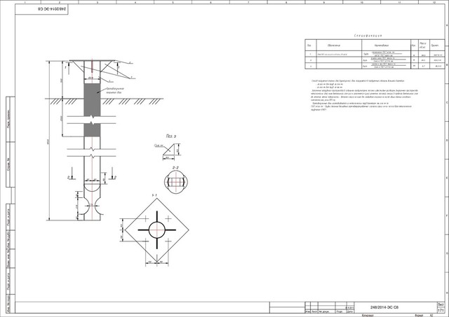 № дубл. Подп. и дата Справ. № Перв. примен. Копировал Формат A2 12 11 10 9 8 7 6 5 4 3 2 1 H G F E D C B A Лист Дата Подп. № докум. Лист Изм. 248/2014-ЭС С8 248/2014-ЭС С8 171 29.10.2015 1 2 2 3 1 δ=10 мм Поз. 3 1 2-2 1-1 2 3 10х600 х600 ГОСТ 19903-74 С345-4 ГОСТ 27772-88 Лист 56,5 кг 2 10х150 х 150 ГОСТ 19903-74 С345-4 ГОСТ 27772-88 Лист 1 500 2500 9500 Противопучинное покрытие сваи 150 150 150 150 150 150 Ø219 73 82 219 82 150 95 95 Способ погружения опорных свай буроопускной. Сваи погружаются в пробуренные скважины большего диаметра: - Ø 320 мм для труб Ø 219 мм; - Ø 250 мм для труб Ø 159 мм. Заполнение затрубного пространства в скважинах предусмотрено песчано-известковым раствором, внутреннее пространство металлических свай ниже деятельного слоя (2,5 м) заполняется сухой цементно-песчаной смесью, в пределах деятельного слоя (до отметок земной поверхности) - бетоном класса не ниже В15 (подробное описание на листе общих данных основного комплекта 248_2014-ППТ.л1). Противопучинные сваи изготавливаются из металлических труб диаметром 159, 219 мм по ГОСТ 8732-78* "Трубы стальные бесшовные горячедеформированные" согласно серии 1.411.3-11см.13."Свая металлическая трубчатая "СМОТ". Поз. Обозначение Наименование Кол. Примеч. С п е ц и ф и к а ц и я Масса ед.,кг 16 395,5 219х8х9500 ГОСТ 8732-78* 09Г2С ГОСТ 19281-89 Труба Свая СМОТ-219/8-9,5-Б-4-БН-(А1+)-ОП-09Г2С 6327,8 кг 16 64 0,7 452,2 кг 28,3