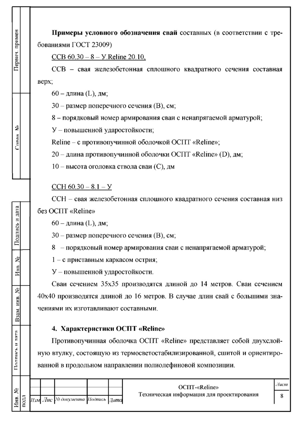 противопучинной оболочкой ОСПТ «Reline»; 20 - длина противопучинной оболочки ОСПТ «Reline» (D), дм; 10 - высота оголовка ствола сваи (С), дм £ а . к с с с е й ~ е * S л о S С Ч о С е с X £ е й СО С Q ее h ее с. Ё с с С60.35 -А 800-Reline 15.10 С - свая железобетонная сплошного квадратного сечения; 60 - длина (L), дм; 35 - размер поперечного сечения (В), см; А800 - свая с напрягаемой арматурной сталью класса А800; Reline - с противопучинной оболочкой ОСПТ «Reline»; 15 - длина противопучинной оболочки ОСПТ «Reline» (D), дм; 10 - высота оголовка ствола сваи (С), дм; Сваи сечением 30x30 производятся длиной до 12 метров. В случае приме­ нения сваи с длиной более 12 метров, сваю производят из 2-х частей с использо­ ванием закладных деталей для возможности произвести соединение с помощью сварных швов. Указанные сваи маркируются как составные сваи. Составные ча­ сти сваи маркируются. Структура условного обозначения ССХ-Х.Х-ХХ-Х- Reline-X.X 1 2 3 4 5 1 - ССВ-свая составная верх ССН- свая составная низ 2 - маркировка сваи по типовой серии с подготовкой для монтажа оболочки 3 - противопучинная оболочка ОСПТ «Reline». Монтируется на верхнюю часть сваи; 4 - длина противопучинной оболочки ОСПТ «Reline»; 5 - высота оголовка ствола сваи; 1 = № X S J п о с Изм Лис Л» документа Подпись Цата OCFlT-«Reline» Техническая информация для проектирования Лист 1