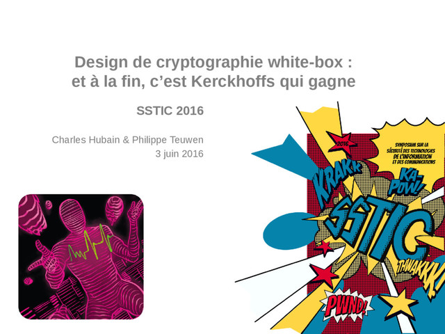 Une présentation de 25mins donnée à SSTIC2016, article complet disponible dans les actes: https://www.sstic.org/2016/presentation/design_de_cryptographie_white-box_et_a_la_fin_c_est_kerckhoffs_qui_gagne/