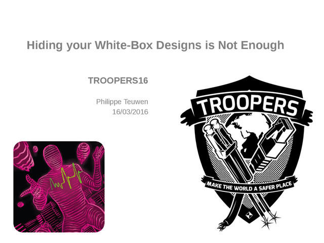 delays? – Trace instructions → realign Building proper white-box technology is a delicate matter… Forget about “perfect” security, but if cost of an attack is larger than the benefit for the attacker, you achieved your goal. Oops, it seems our cheap attack raised the bar... Other countermeasures?