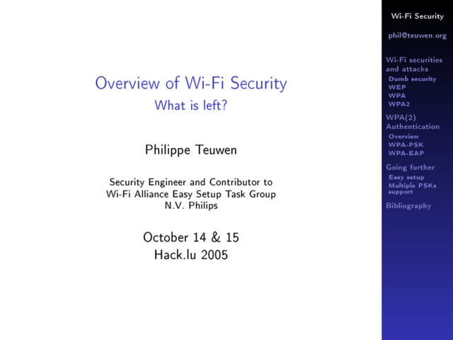 WPA WPA2 WPA(2) Authentication Overview WPA-PSK WPA-EAP Going further Easy setup Multiple PSKs support Bibliography WPA(2) Behind the scene Requires a Pair-wise Master Key, PMK PTK derivation PTK ← PRF-X (PMK, . . . "Pairwise key expansion", . . . min(AA, SA) max(AA, SA) . . . min(ANonce, SNonce) max(ANonce, SNonce)) PTK is split in several keys PTK ≡ KCK/MK KEK TEK ≡ TK . . . MIC = MIC(MK, EAPOL) Conclusion: All secrets are derived from PMK and public information WPA2: PMKID, key caching, pre-auth...