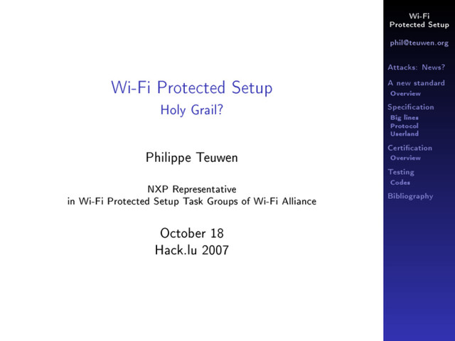 Specication Big lines Protocol Userland Certication Overview Testing Codes Bibliography Outline 1 Attacks: any news since hack.lu 2006? 2 A new standard Overview 3 Specication The big lines Core protocol User methods 4 Certication Program Overview 5 Testing Codes 6 Bibliography & Resources