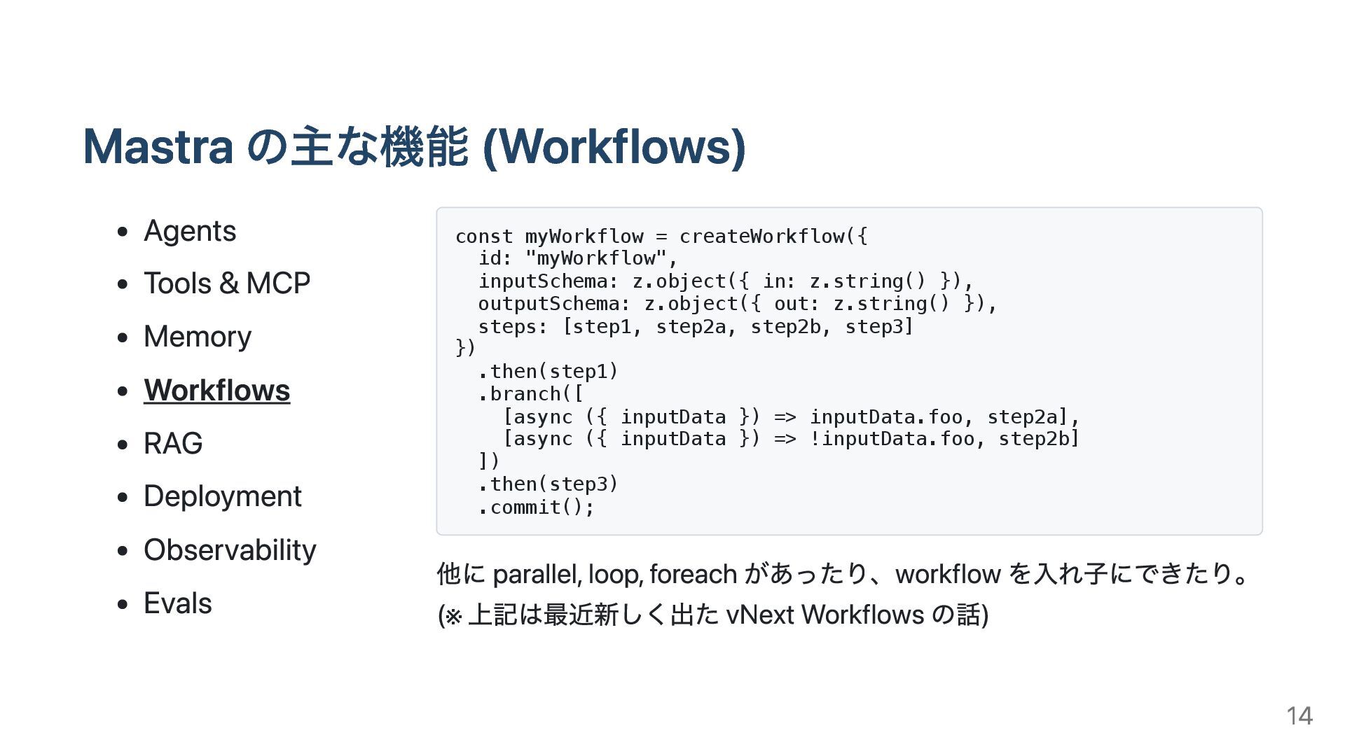 Deployment Observability Evals const myWorkflow = createWorkflow({ id: "myWorkflow", inputSchema: z.object({ in: z.string() }), outputSchema: z.object({ out: z.string() }), steps: [step1, step2a, step2b, step3] }) .then(step1) .branch([ [async ({ inputData }) => inputData.foo, step2a], [async ({ inputData }) => !inputData.foo, step2b] ]) .then(step3) .commit(); 他に parallel, loop, foreach があったり、workflow を入れ子にできたり。 (※ 上記は最近新しく出た vNext Workflows の話) 14