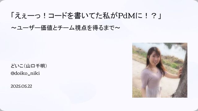 「えぇーっ!コードを書いてた私がPdMに!?」 〜ユーザー価値とチーム視点を得るまで〜 どいこ(山口千明) @doiko_niki 2025.05.22