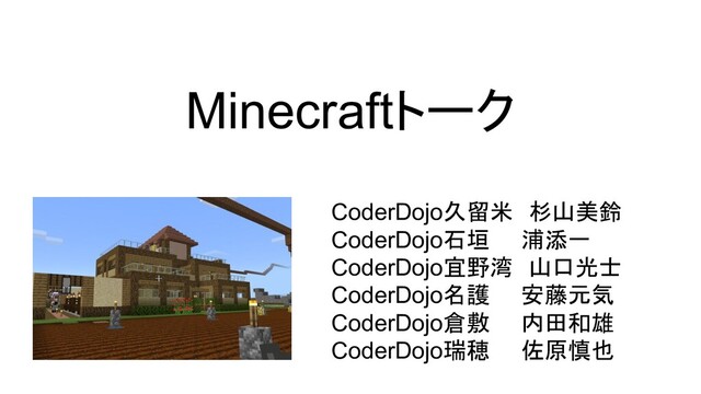 Minecraftトーク CoderDojo久留米 杉山美鈴 CoderDojo石垣 浦添一 CoderDojo宜野湾 山口光士 CoderDojo名護 安藤元気 CoderDojo倉敷 内田和雄 CoderDojo瑞穂 佐原慎也