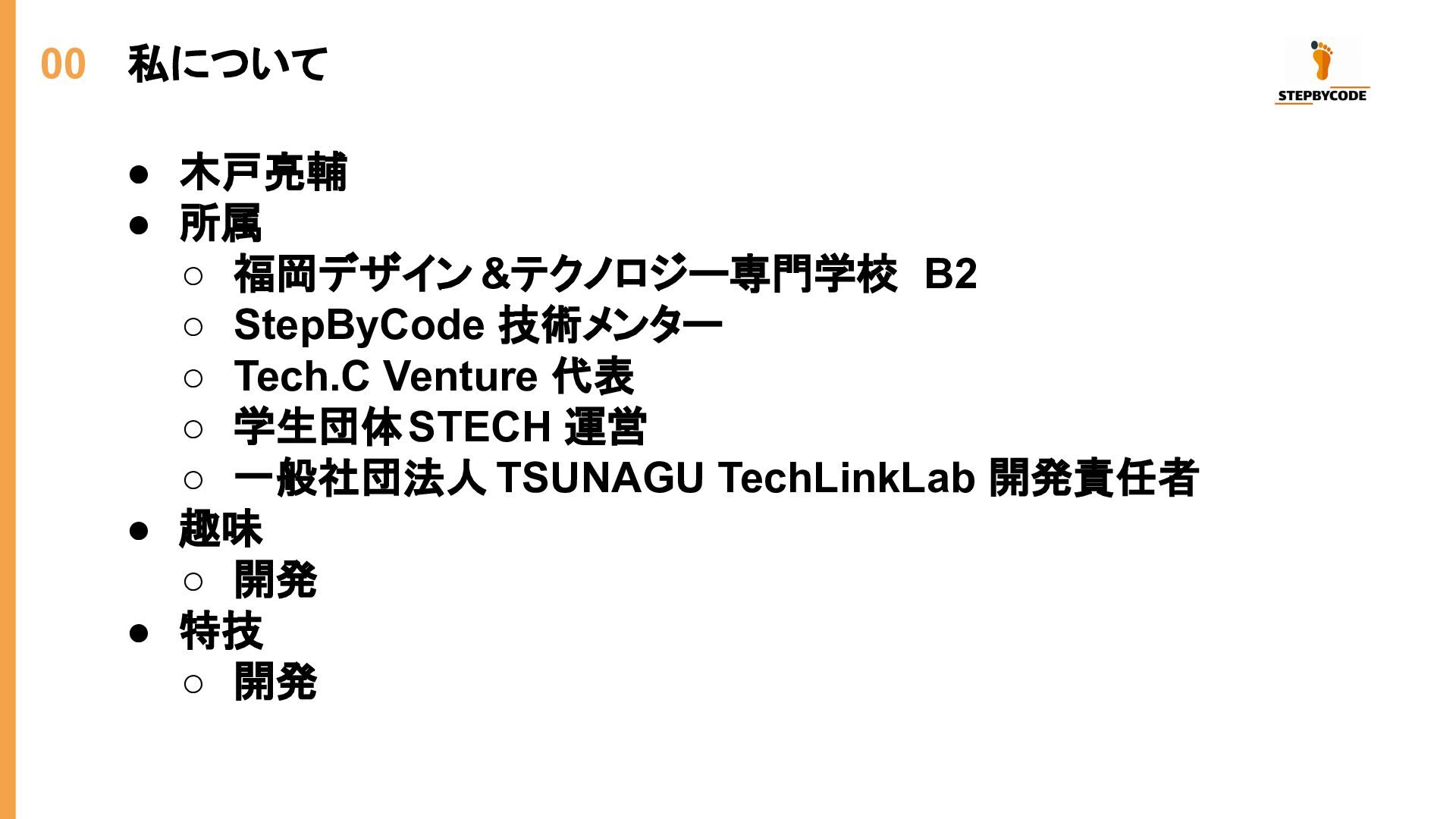 ◦ StepByCode 技術メンター ◦ Tech.C Venture 代表 ◦ 学生団体STECH 運営 ◦ 一般社団法人 TSUNAGU TechLinkLab 開発責任者 • 趣味 ◦ 開発 • 特技 ◦ 開発