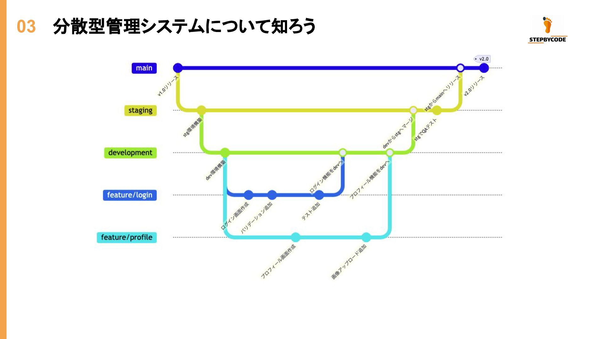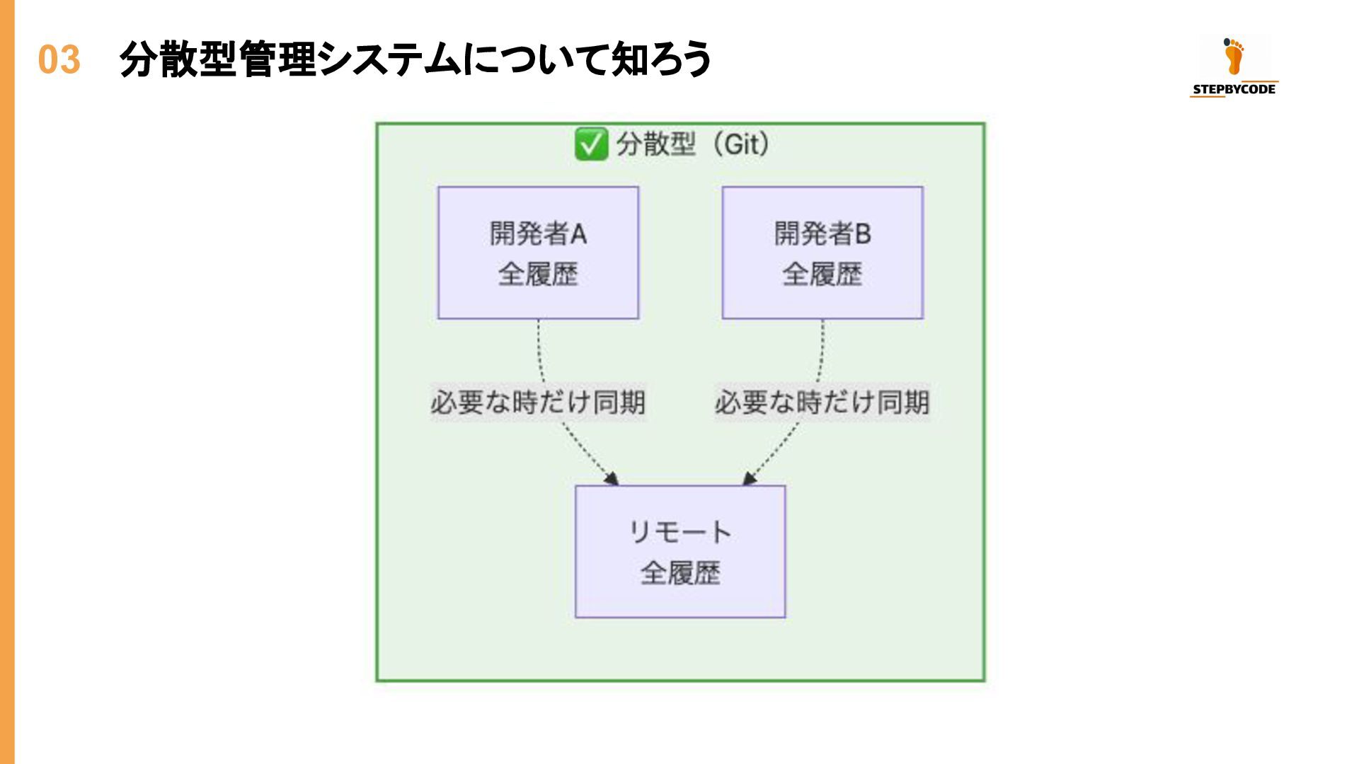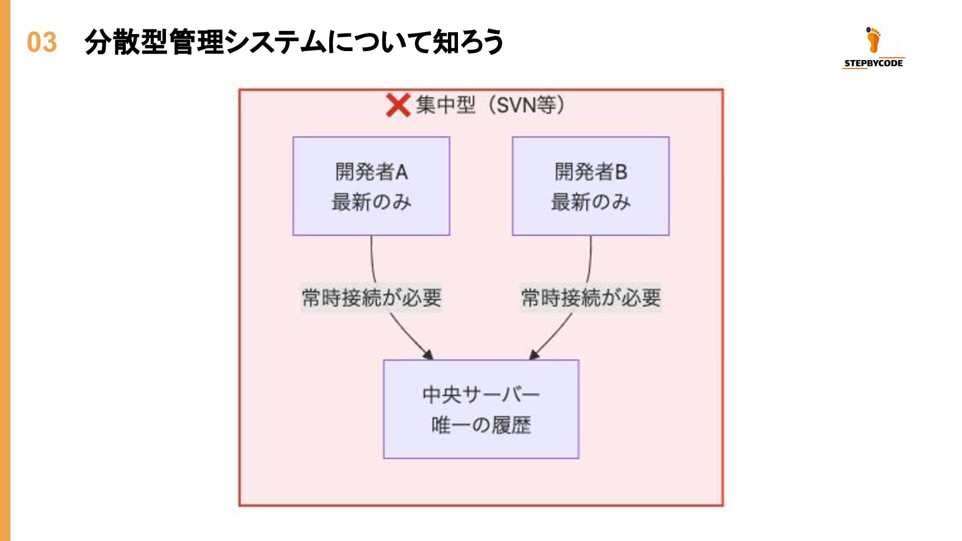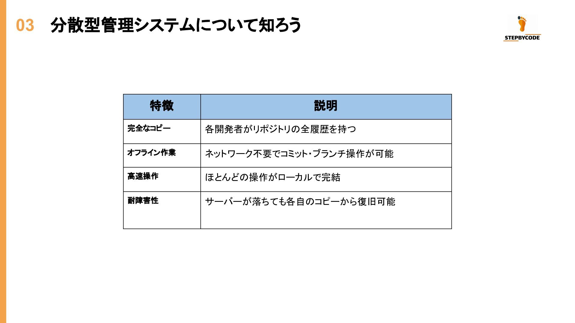 03 分散型管理システムについて知ろう 特徴 説明 完全なコピー 各開発者がリポジトリの全履歴を持つ オフライン作業 ネットワーク不要でコミット・ブランチ操作が可能 高速操作 ほとんどの操作がローカルで完結