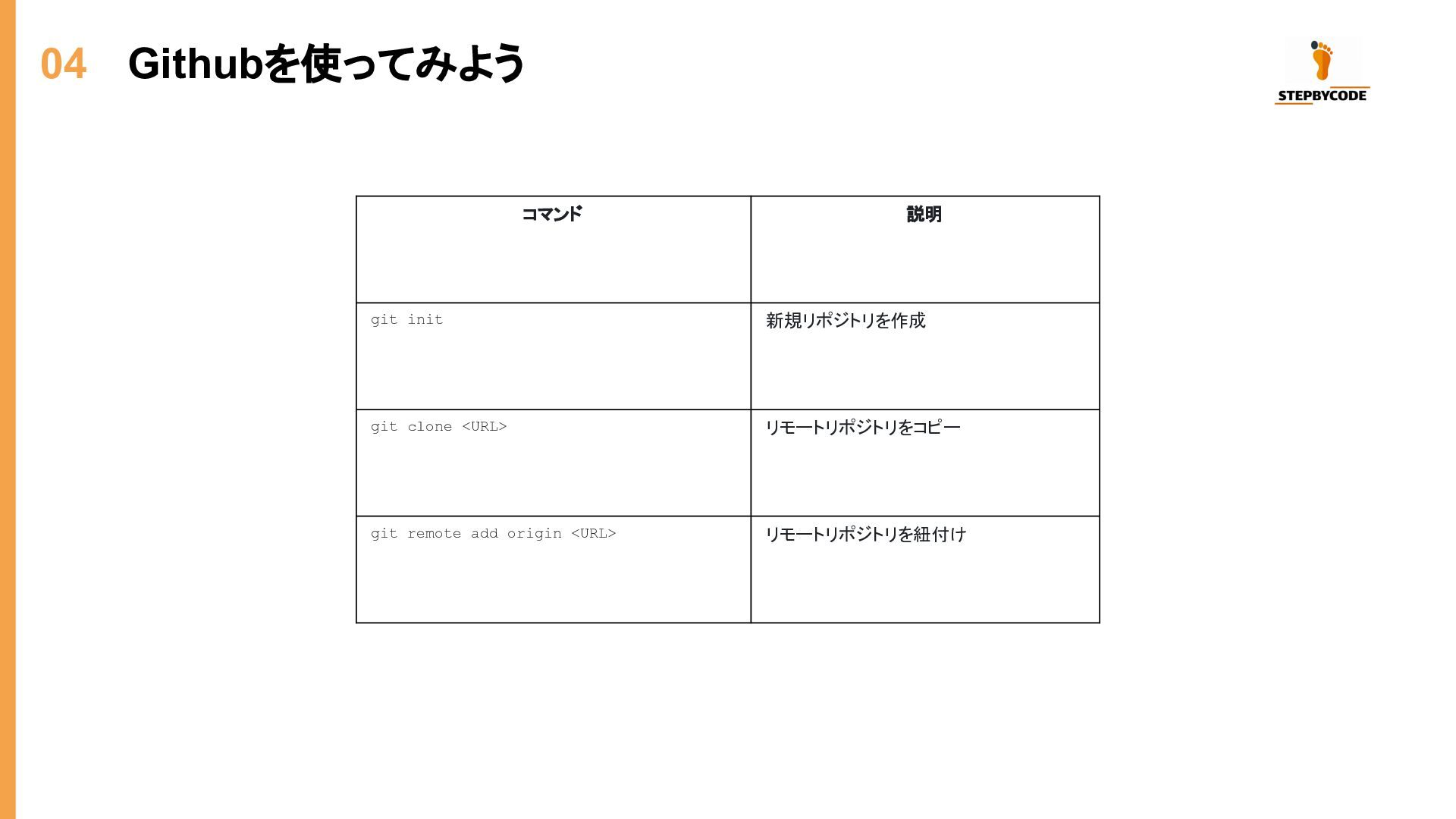 04 Githubを使ってみよう コマンド 説明 git init 新規リポジトリを作成 git clone <URL>